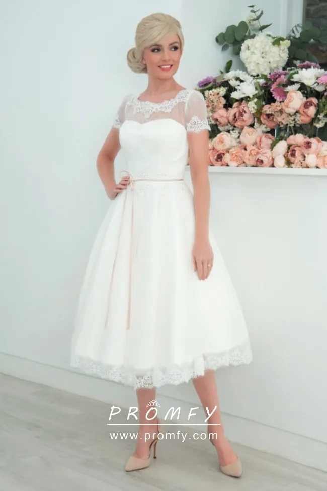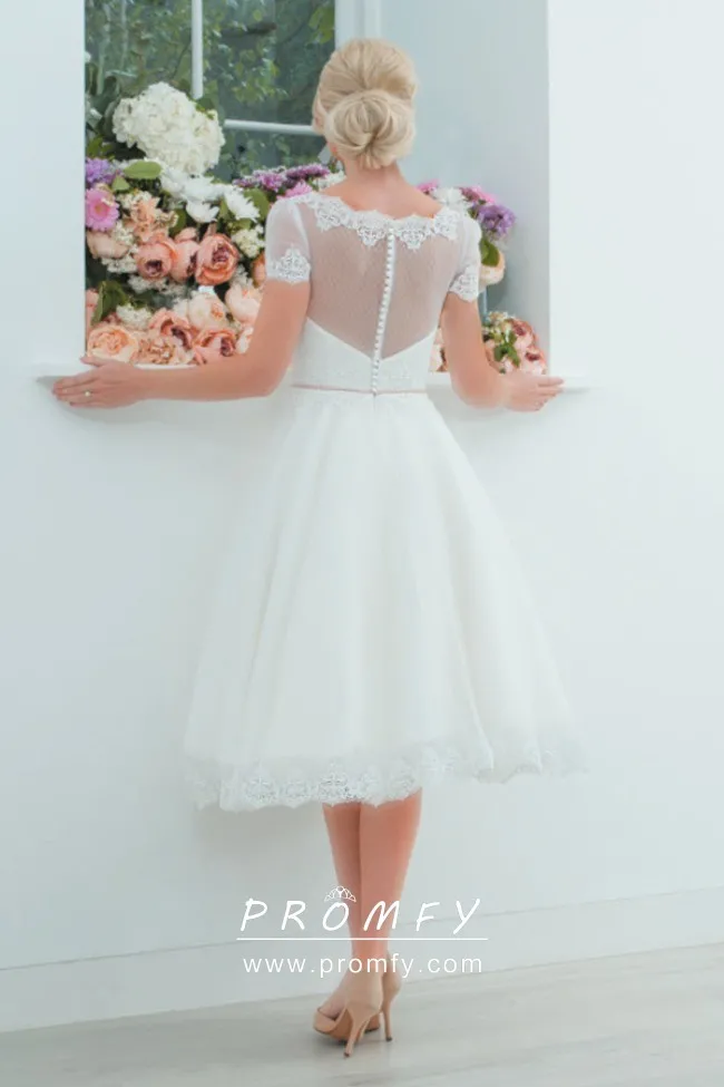 Illusion lace and mesh-covered sweetheart neckline with short sleeves. 1950s-inspired vintage ivory satin with lace tea-length A-line spring/summer/fall wedding, bridal shower, or reception dress. Scalloped illusion back with button decoration.