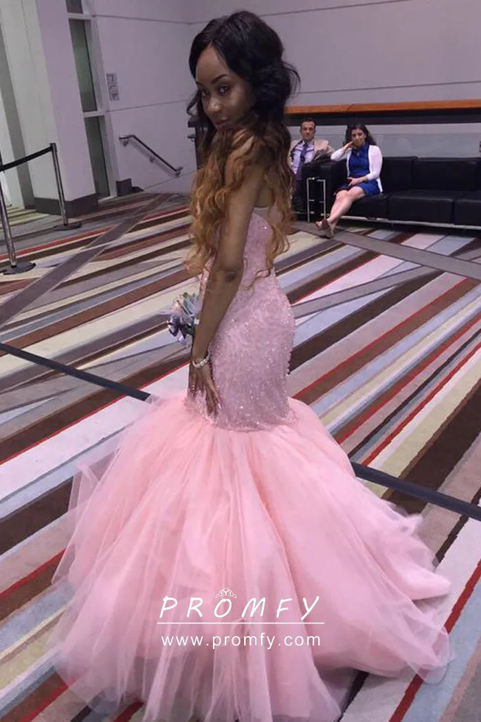 Drop Waist Baby Pink Beads Tulle Trumpet Prom Dress