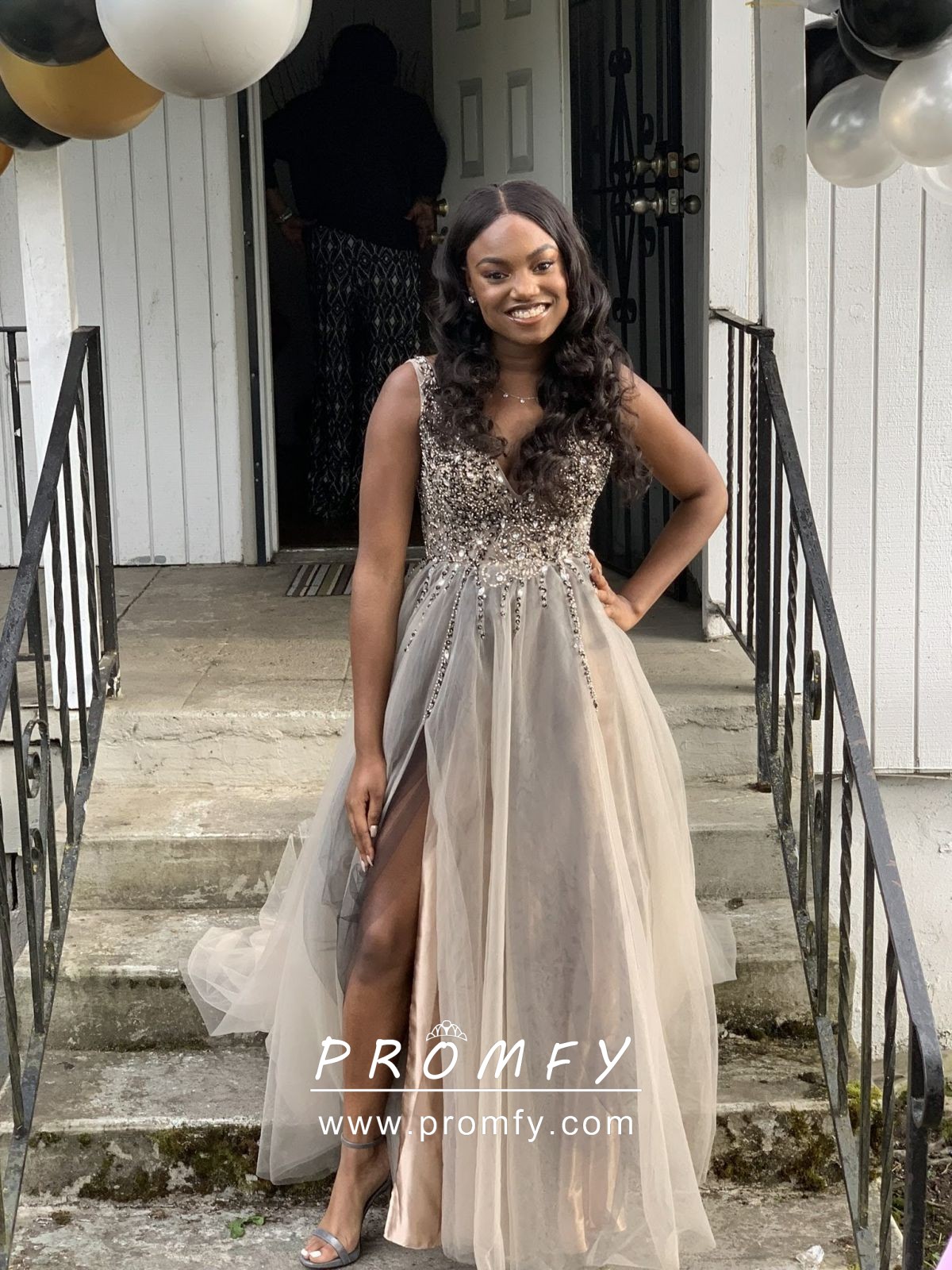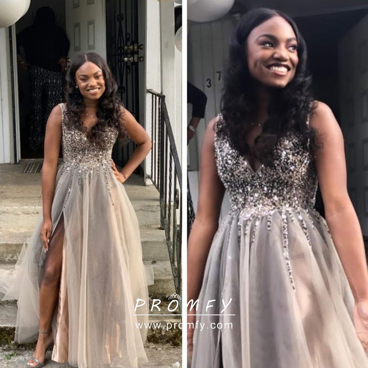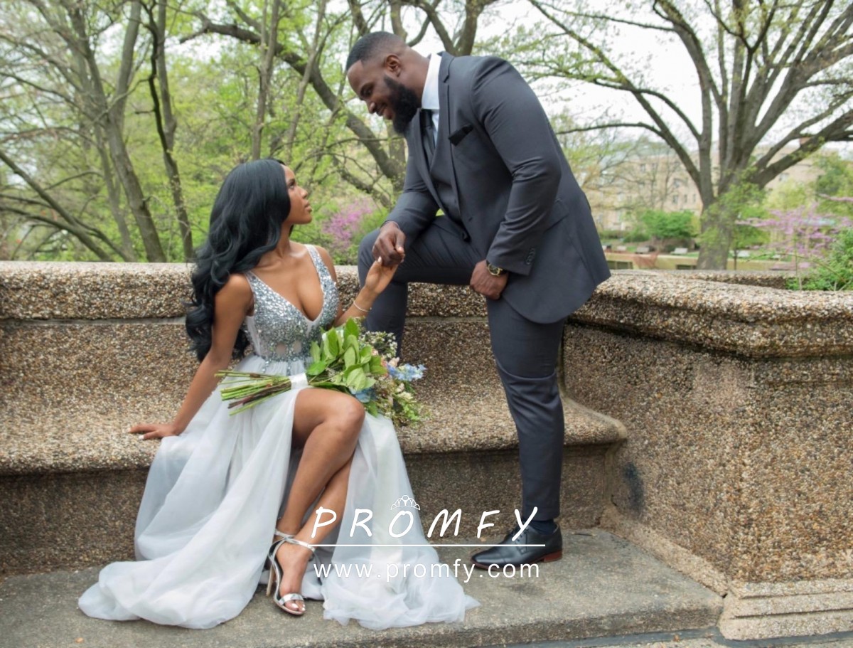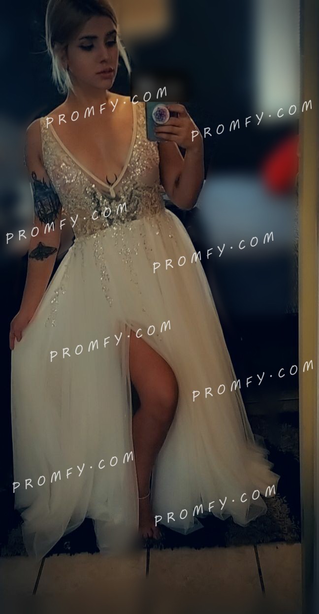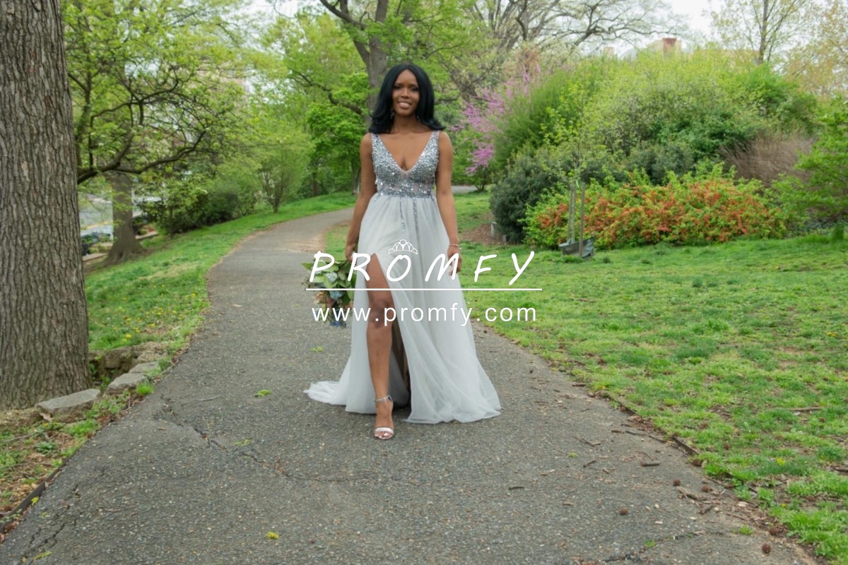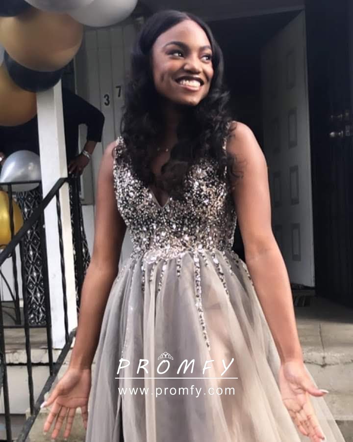 Beaded Gray Tulle Plunging Neck Split Prom Dress