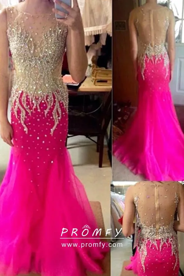 Bedazzling gold beads embellished illusion bodice, uniquely beaded hot pink satin long mermaid prom pageant dress with tulle godet skit, zipper up sheer illusion open back and short train.