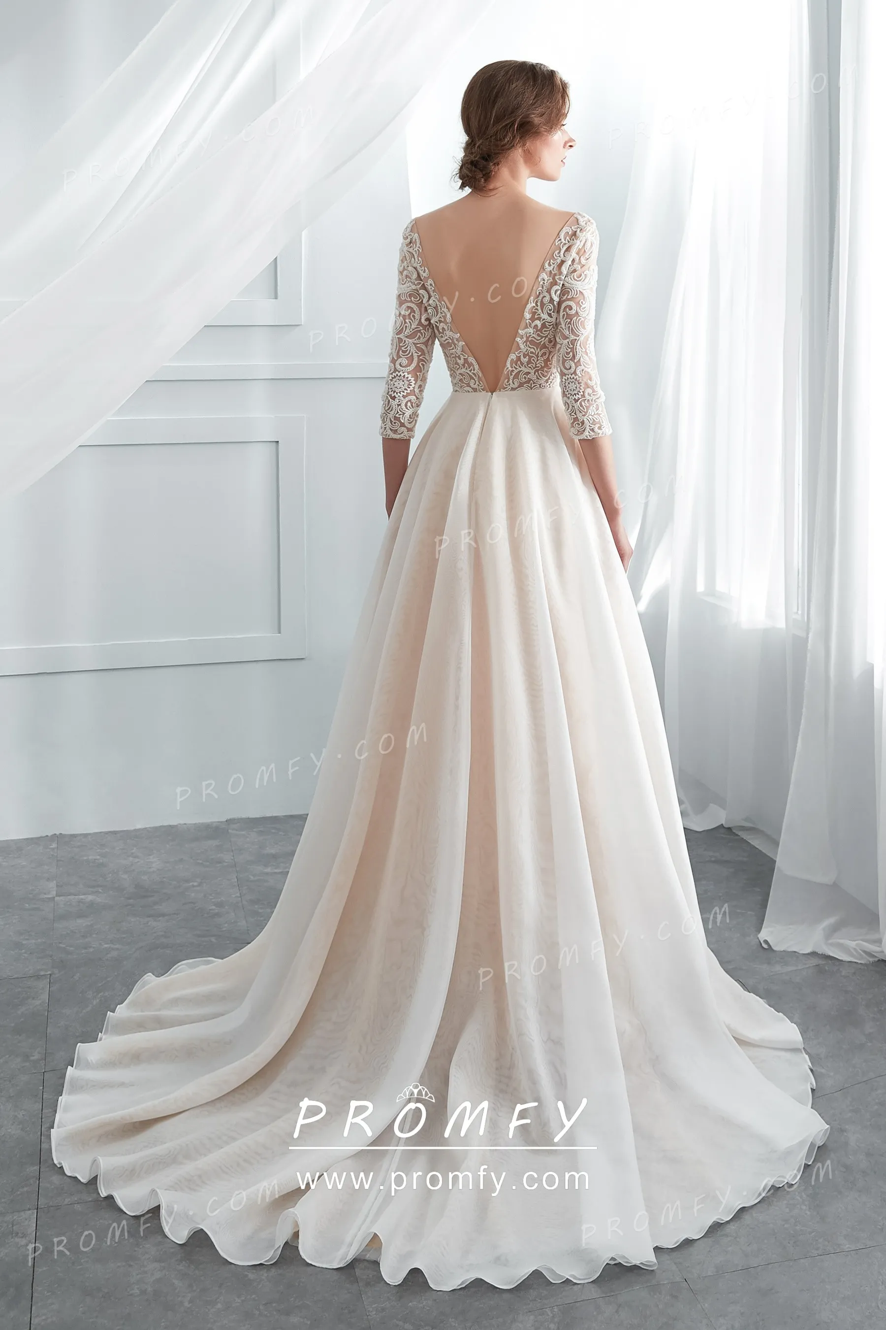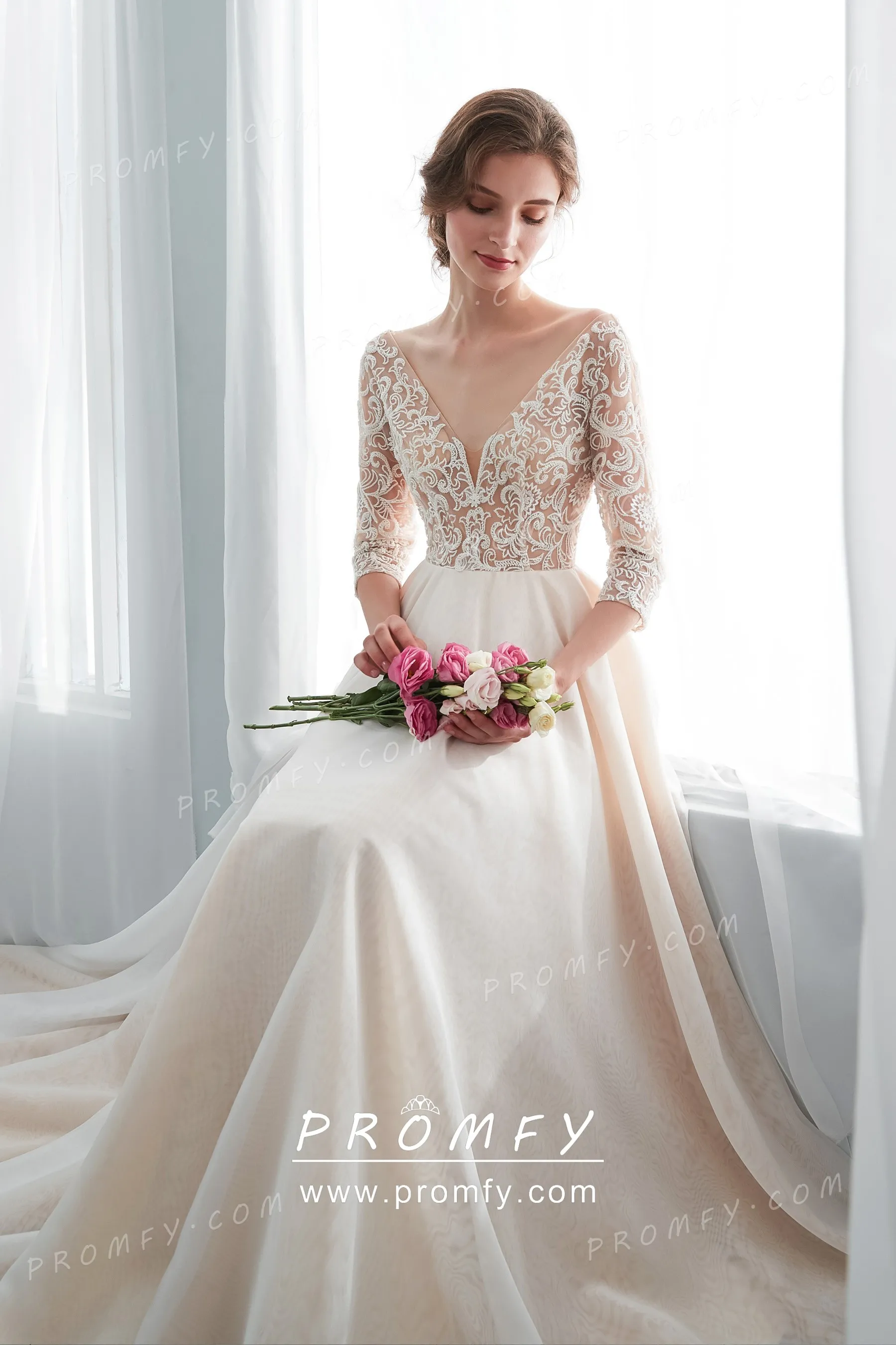 Champagne Beaded Lace 3/4 Sleeve A-line Wedding Dress