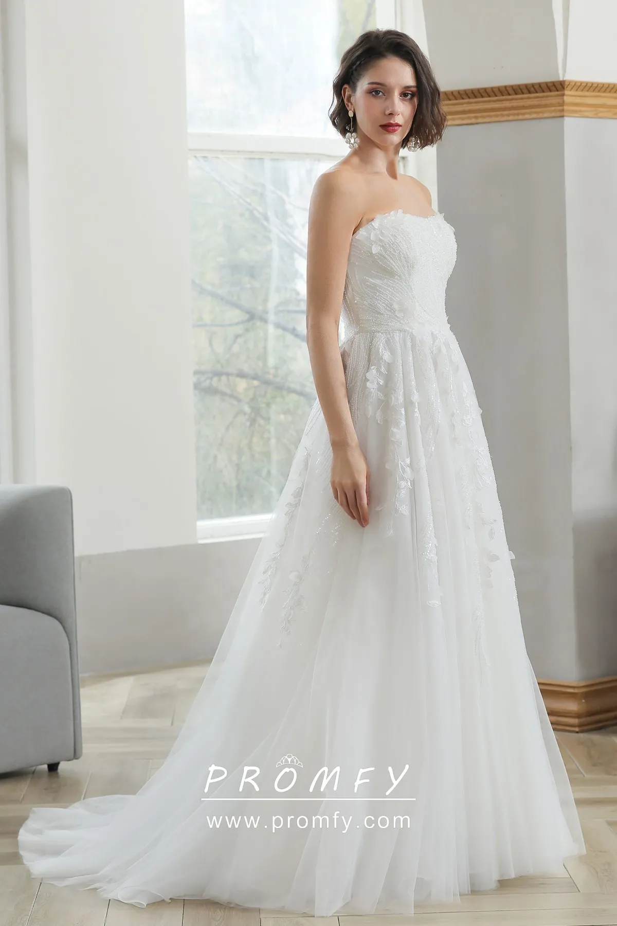 Classic beaded s and leaf shaped lace embellished ivory tulle A-line spring/summer/fall wedding dress. Strapless curved neckline, zipper up closure low back and court train.
