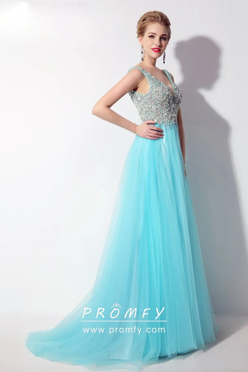 Beaded Pool Blue Satin and Tulle A-line Prom Dress