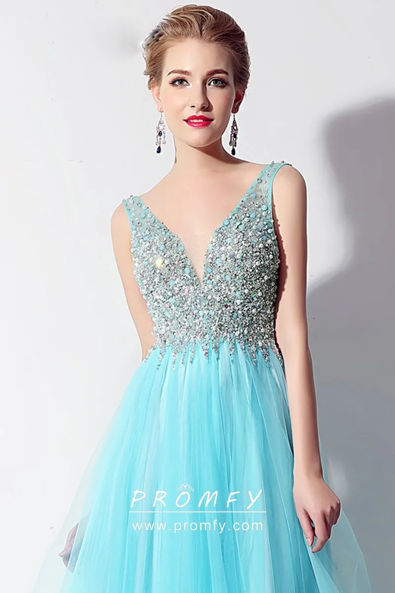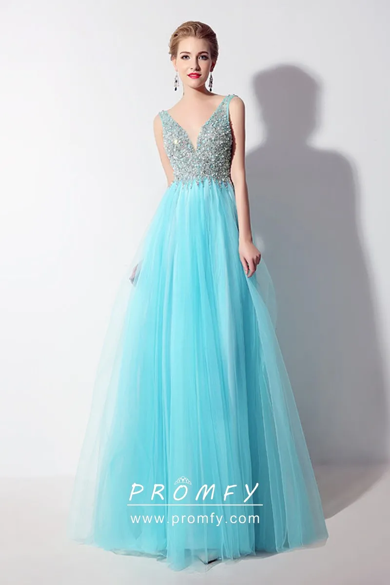 Bedazzling beaded bodice, deep V neckline, sleeveless, pool blue satin and tulle long A-line prom or birthday party dress, low V back and short train.