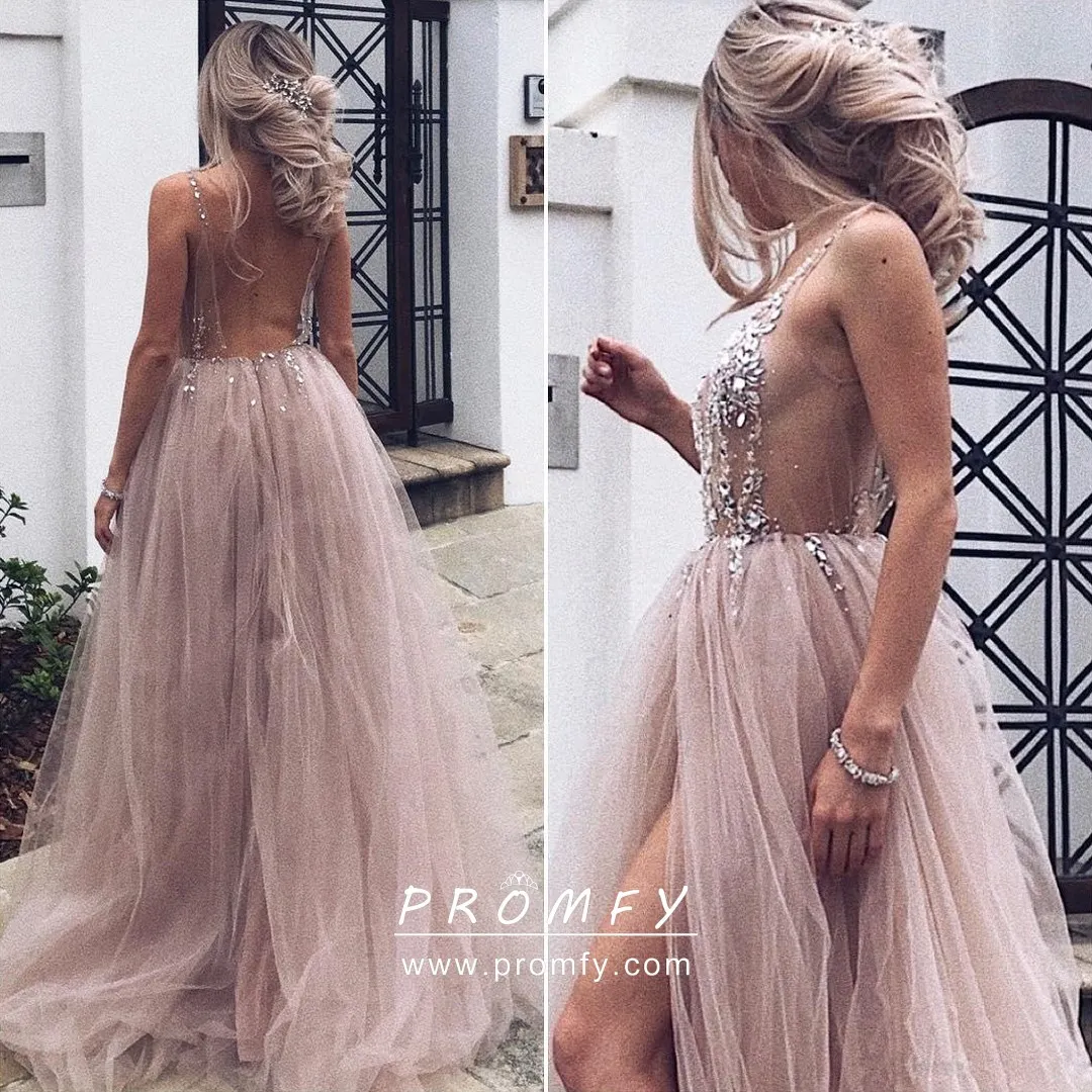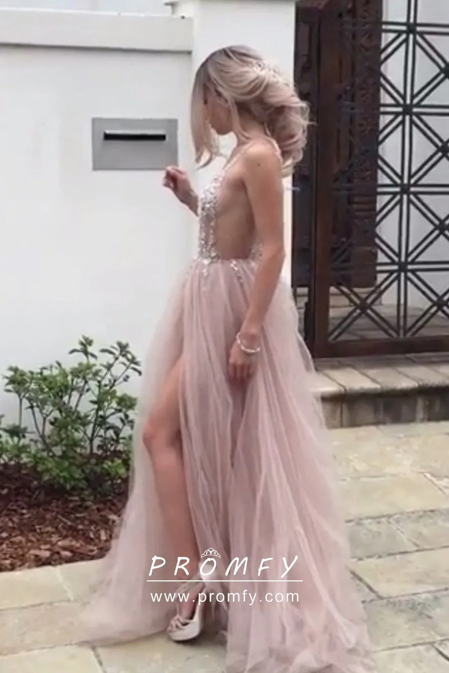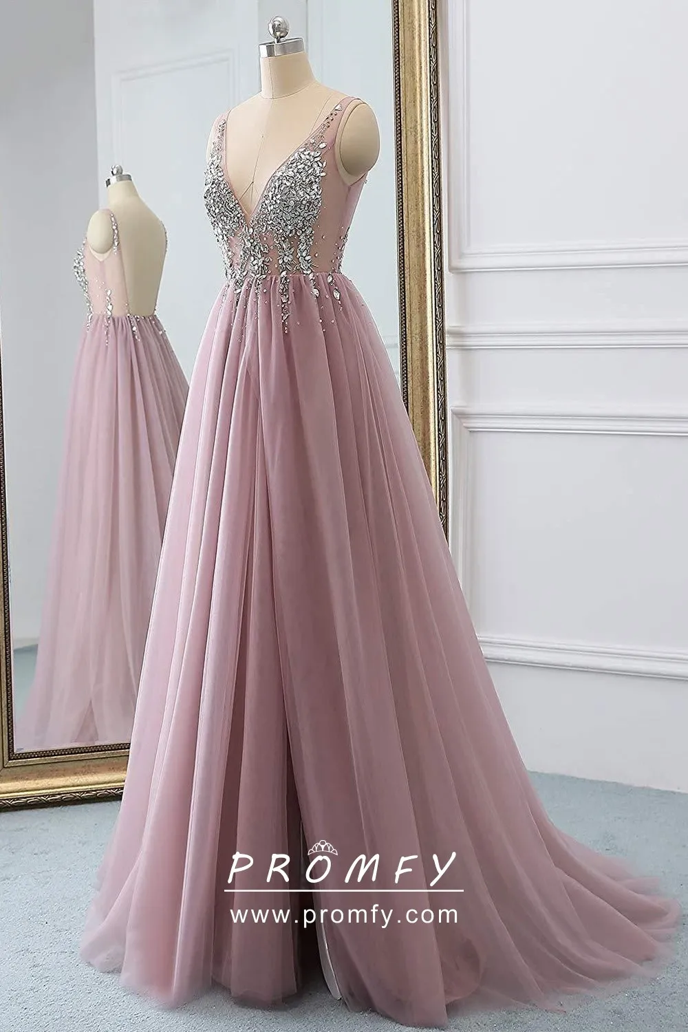 Flirty beaded sheer tulle bodice, deep V neckline, sleeveless, mauve tulle long A-line sparkly sexy backless prom or birthday party gown with a thigh-high slit, low back.