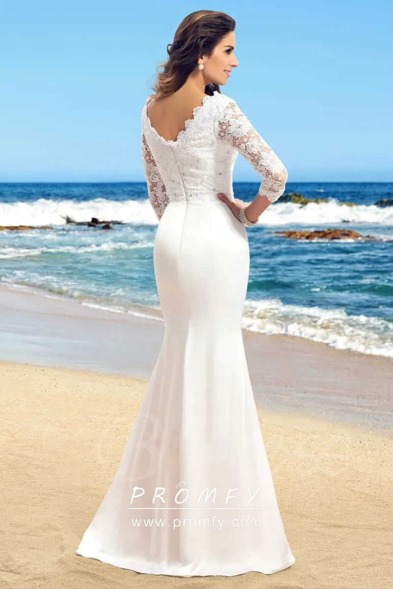 Beaded white lace and satin modest and elegant mermaid long beach spring/fall wedding gown. Scalloped scoop neckline with 3/4 sleeves. Zipper up V back.