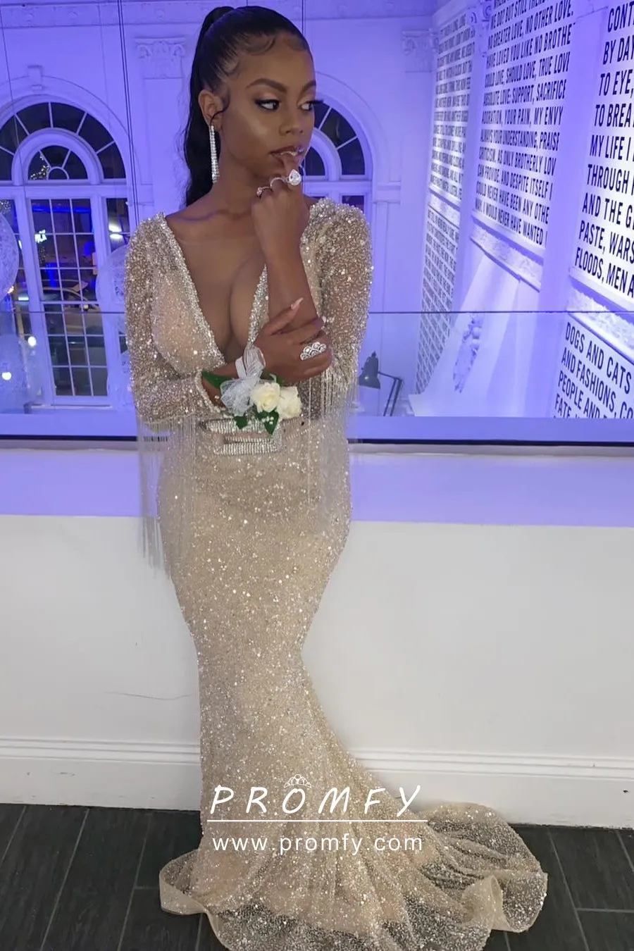 Bedazzled beading mermaid long African American beige prom dress. Sexy plunging V neckline, long sleeves with tassels detailing. Short train.