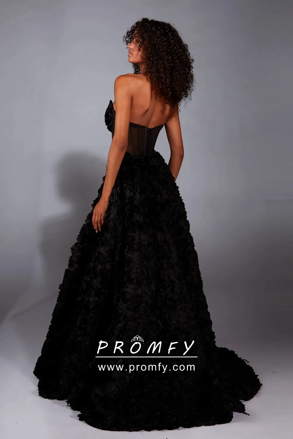Stunning black 3D rosette flower long formal dress for wedding and prom. A voluminous A-line silhouette with a dramatically 3D rosette full skirt with a side thigh-high slit. An elegant and alluring strapless corset bodice defines the waist.