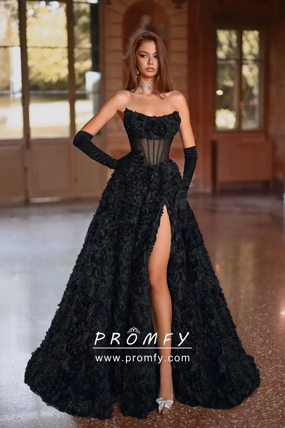 Elegant Black 3D Rosette Corset Slit Formal Gown