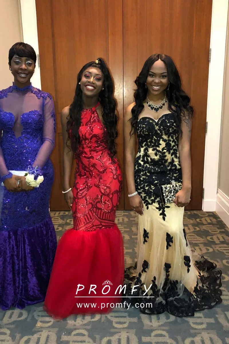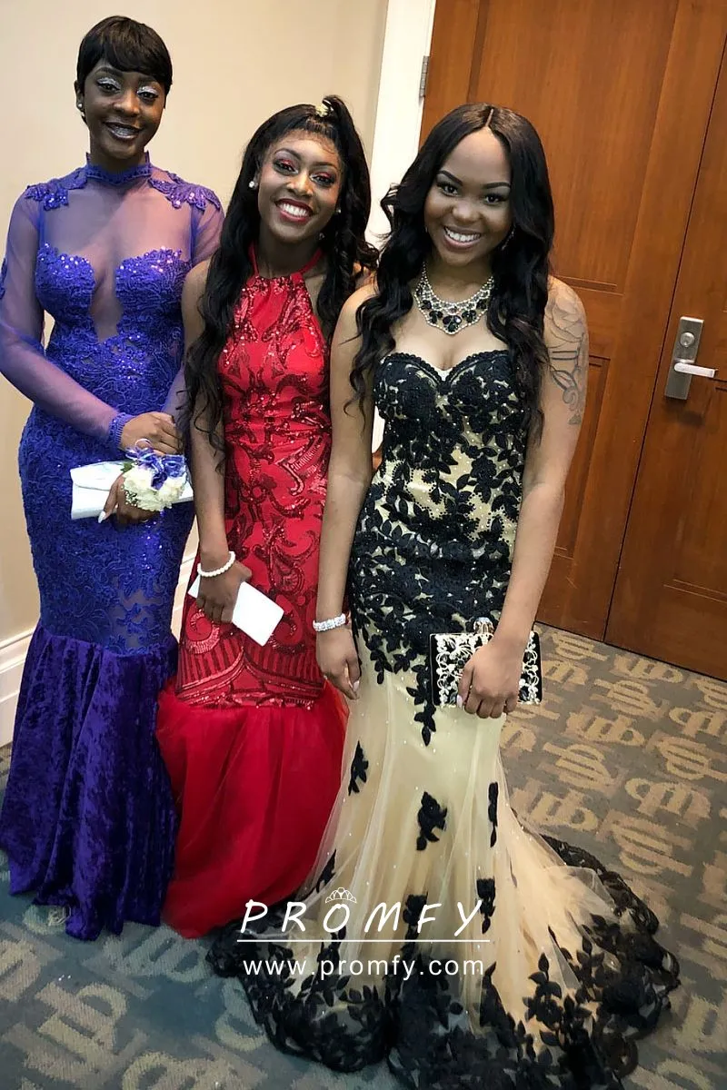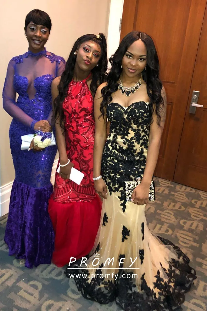 Unique black lace appliqued nude tulle mermaid floor-length African American long prom dress. Strapless sweetheart neckline.