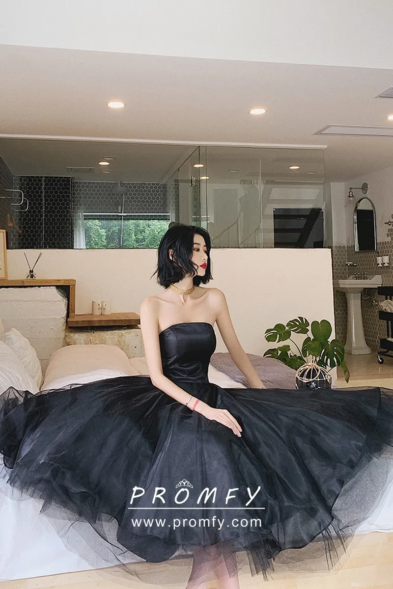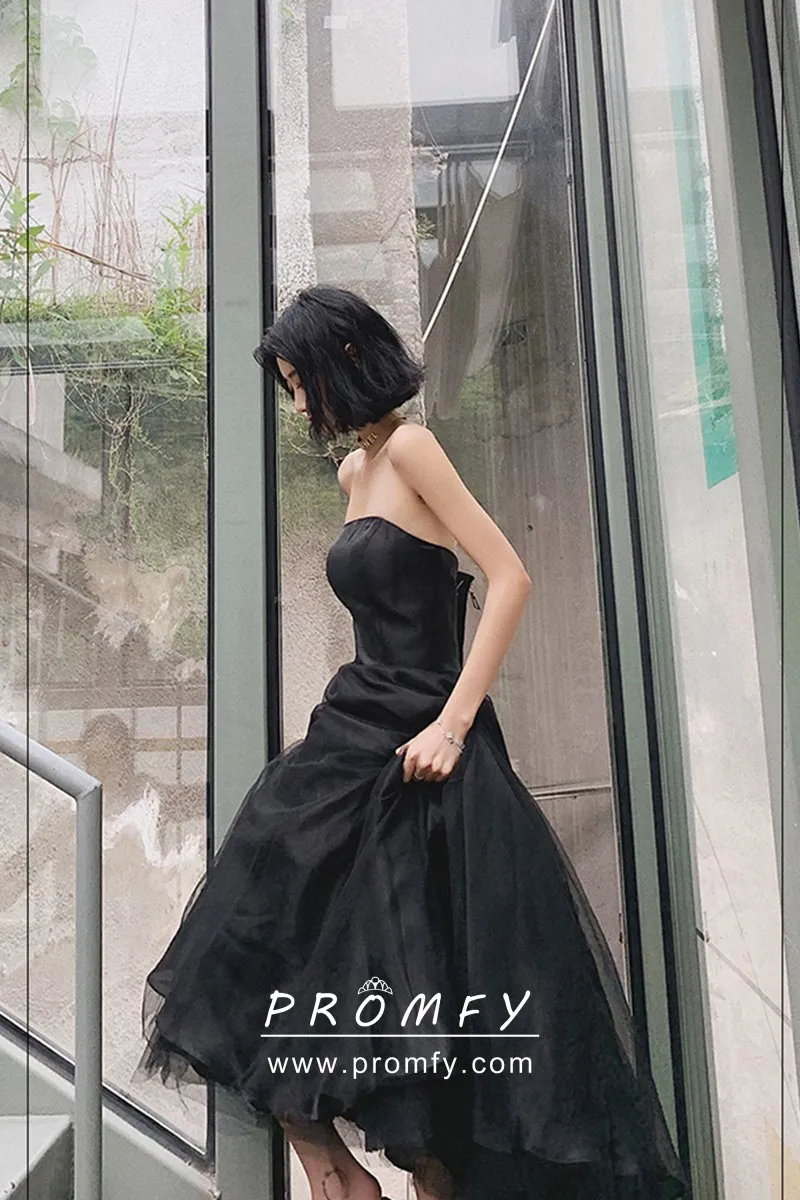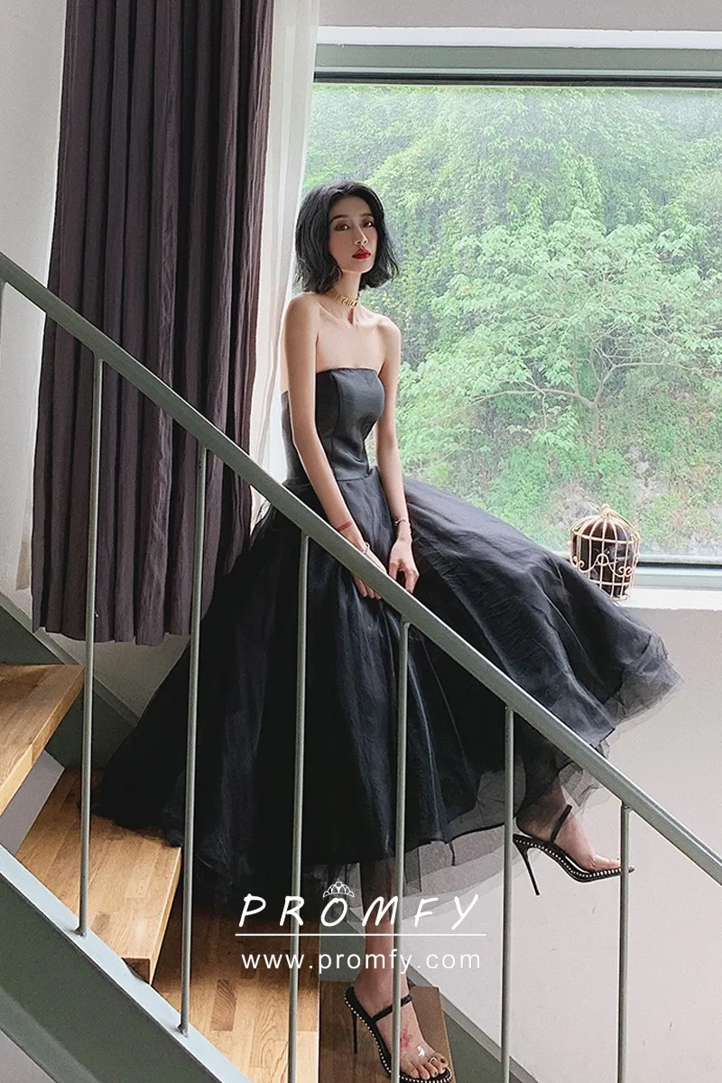 Chic Black Satin Tulle Strapless Ankle Length Dress