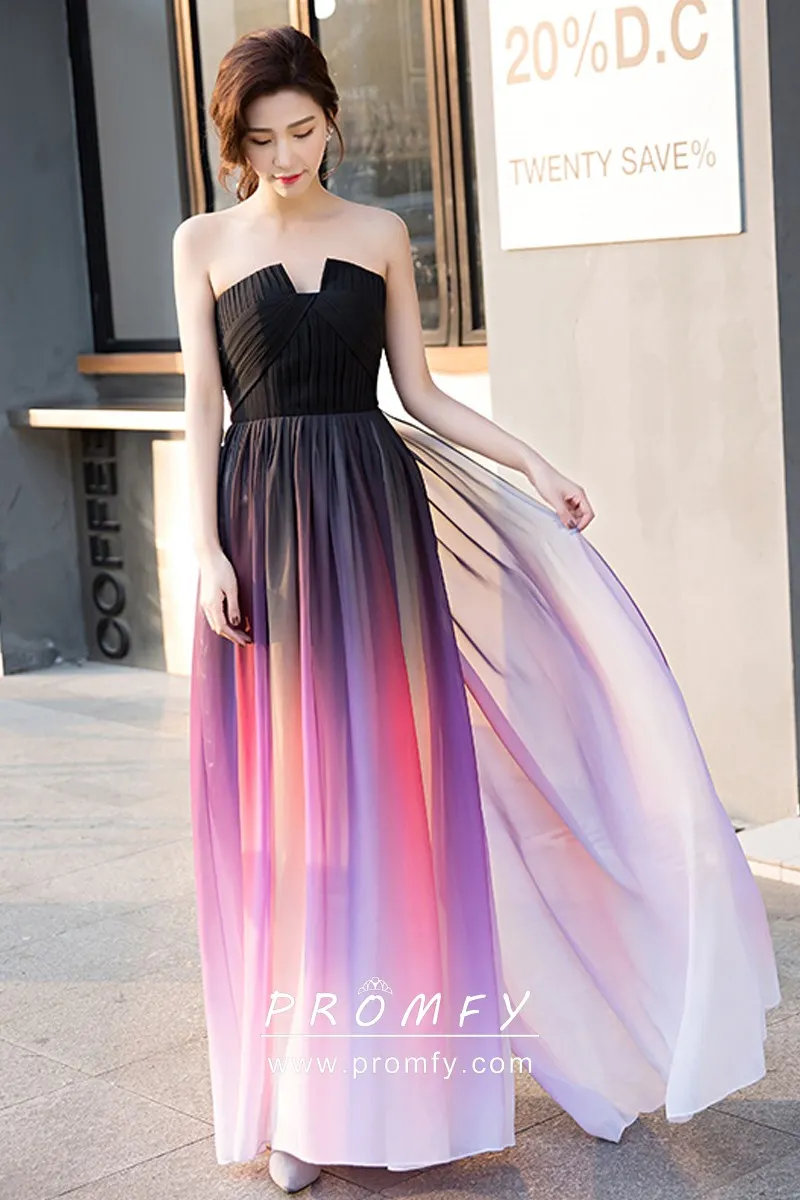 Unusual black to red/purple/white multi-color ombre chiffon long A-line unique bridesmaid, prom, or evening formal dress, strapless curved neckline ruched bodice, low back with exclusive cut-out details.