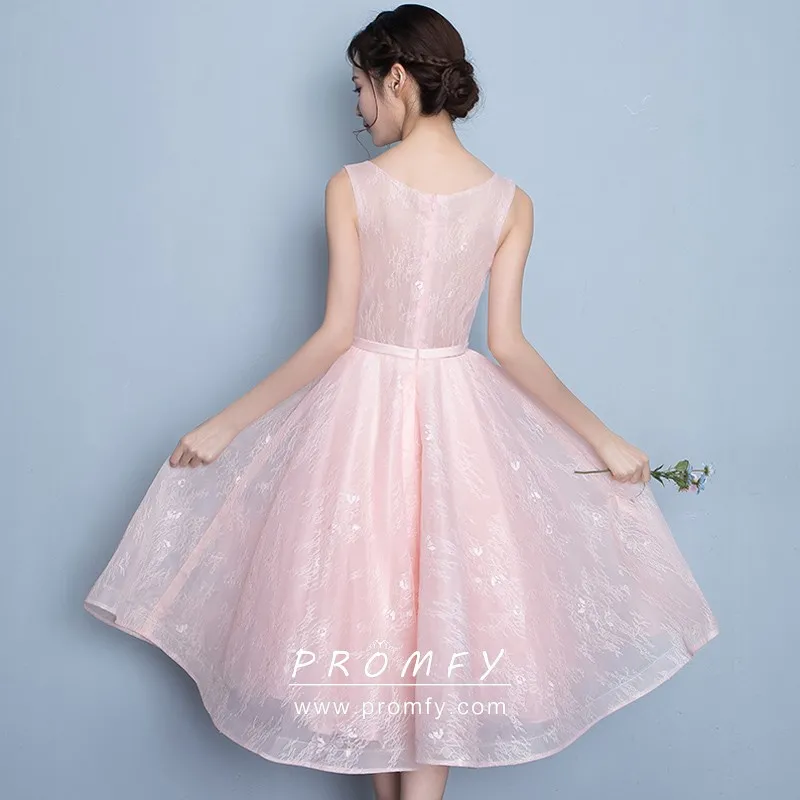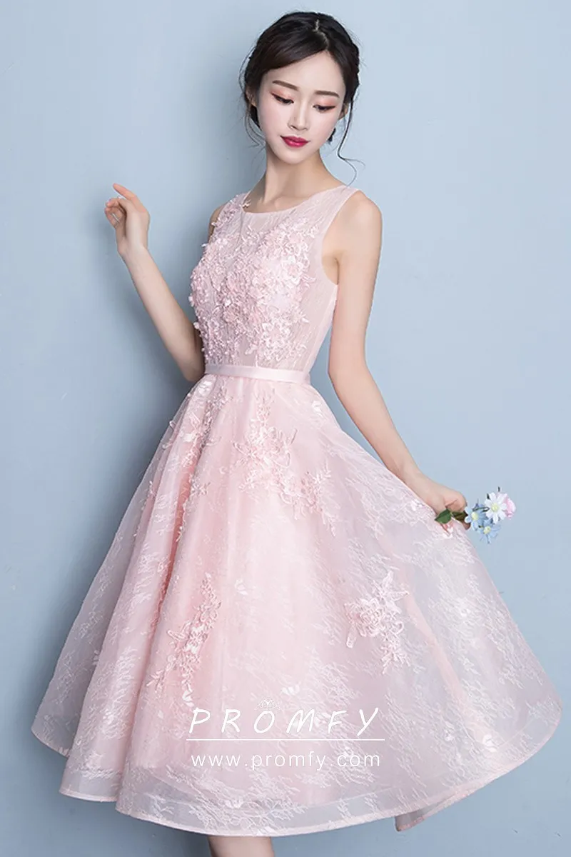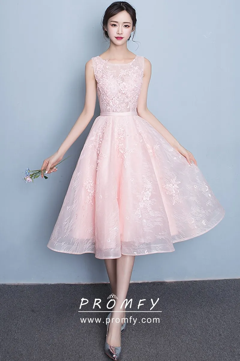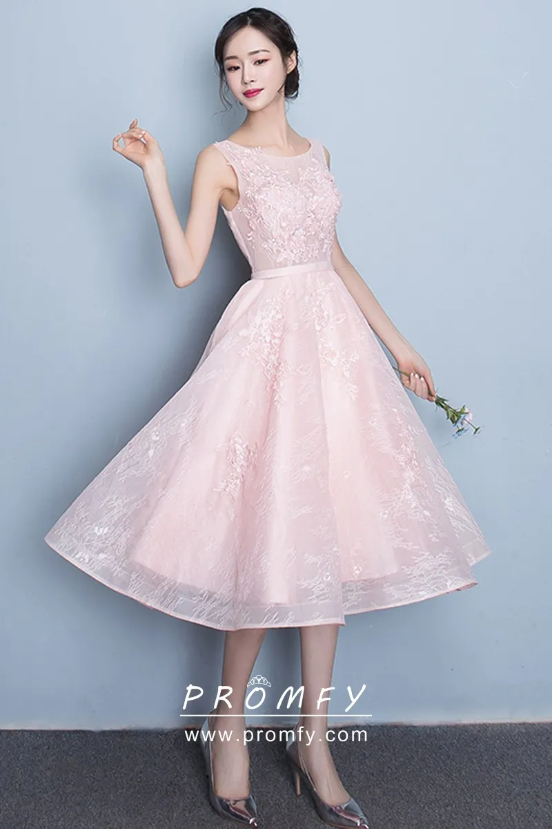 Demure blush lace tea-length A-line prom, homecoming, or graduation party dress, jewel neckline sleeveless bodice with lace appliques, zipper up back.