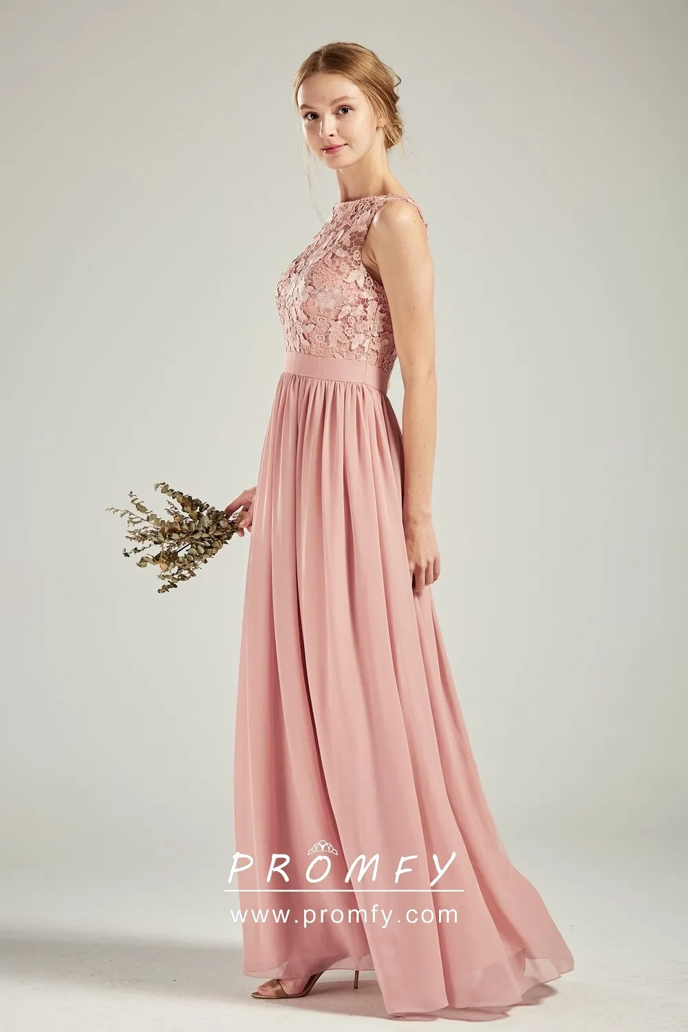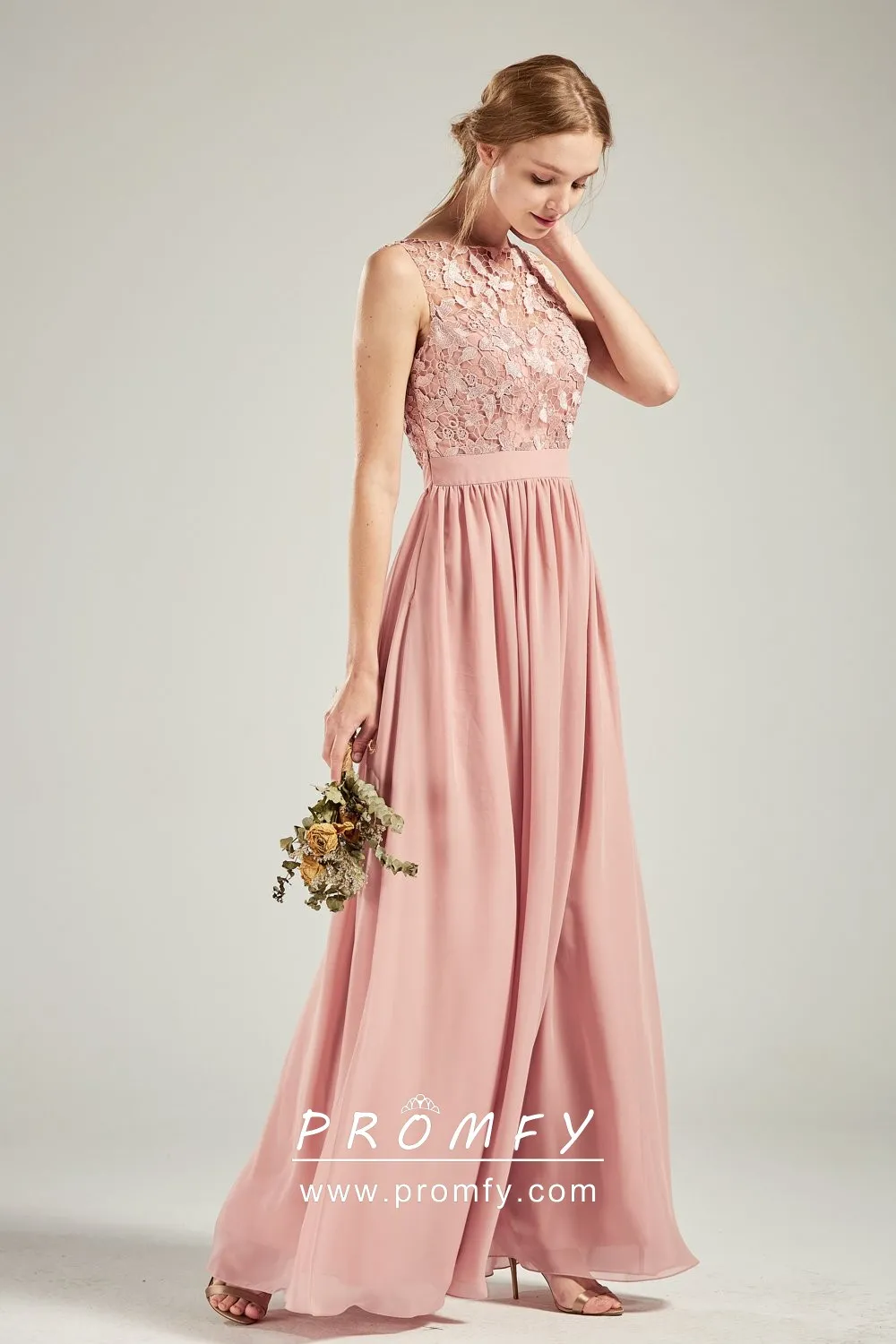 Elegant blush lace and chiffon long bridesmaid, wedding guest, or evening formal dress. The sleeveless bodice features a flattering illusion bateau neckline and pleated skirt. Wide waistband, floor length, and U back.