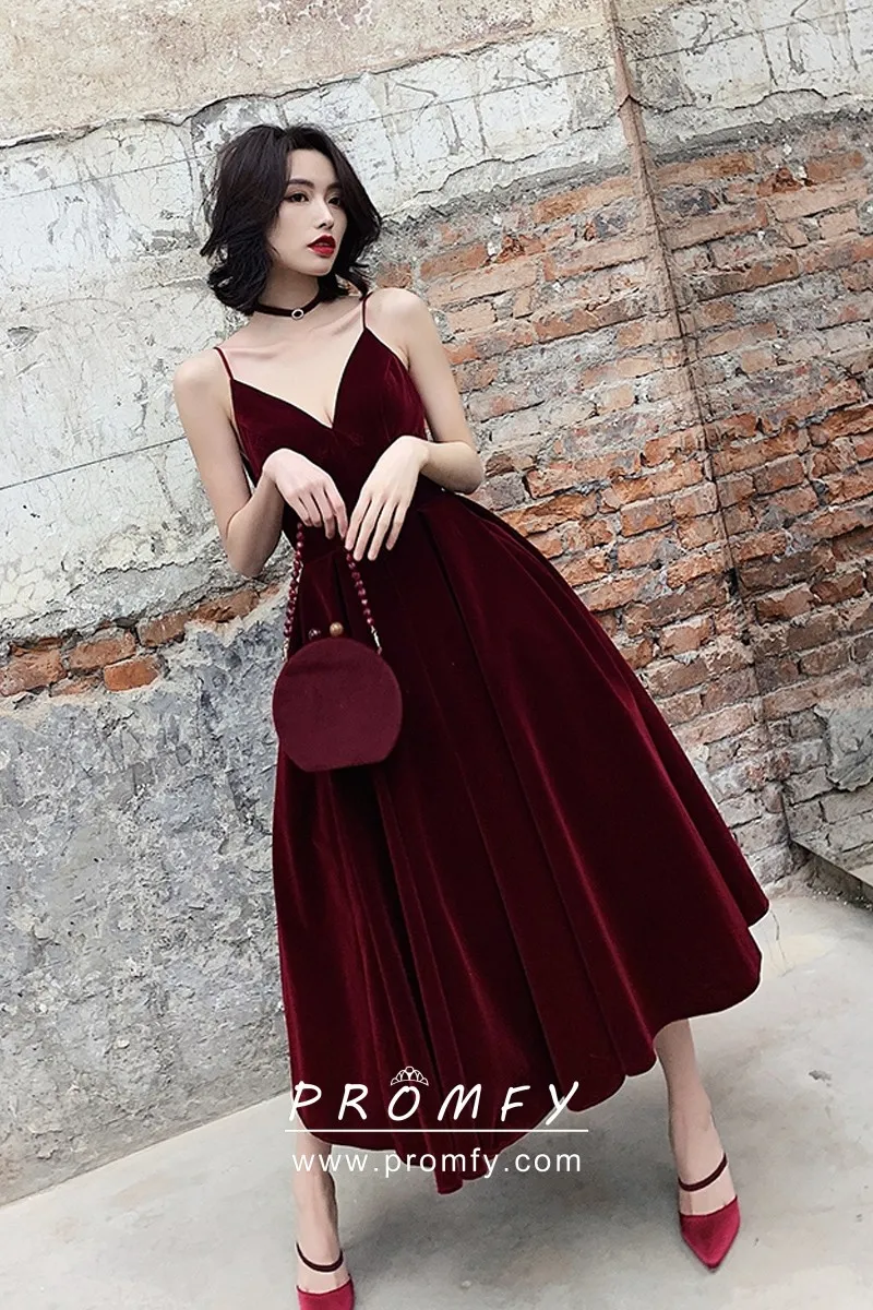 Simply cabernet velvet tea-length A-line prom, military ball, or bridesmaid party dress, V neckline with spaghetti straps, zipper up low V back.