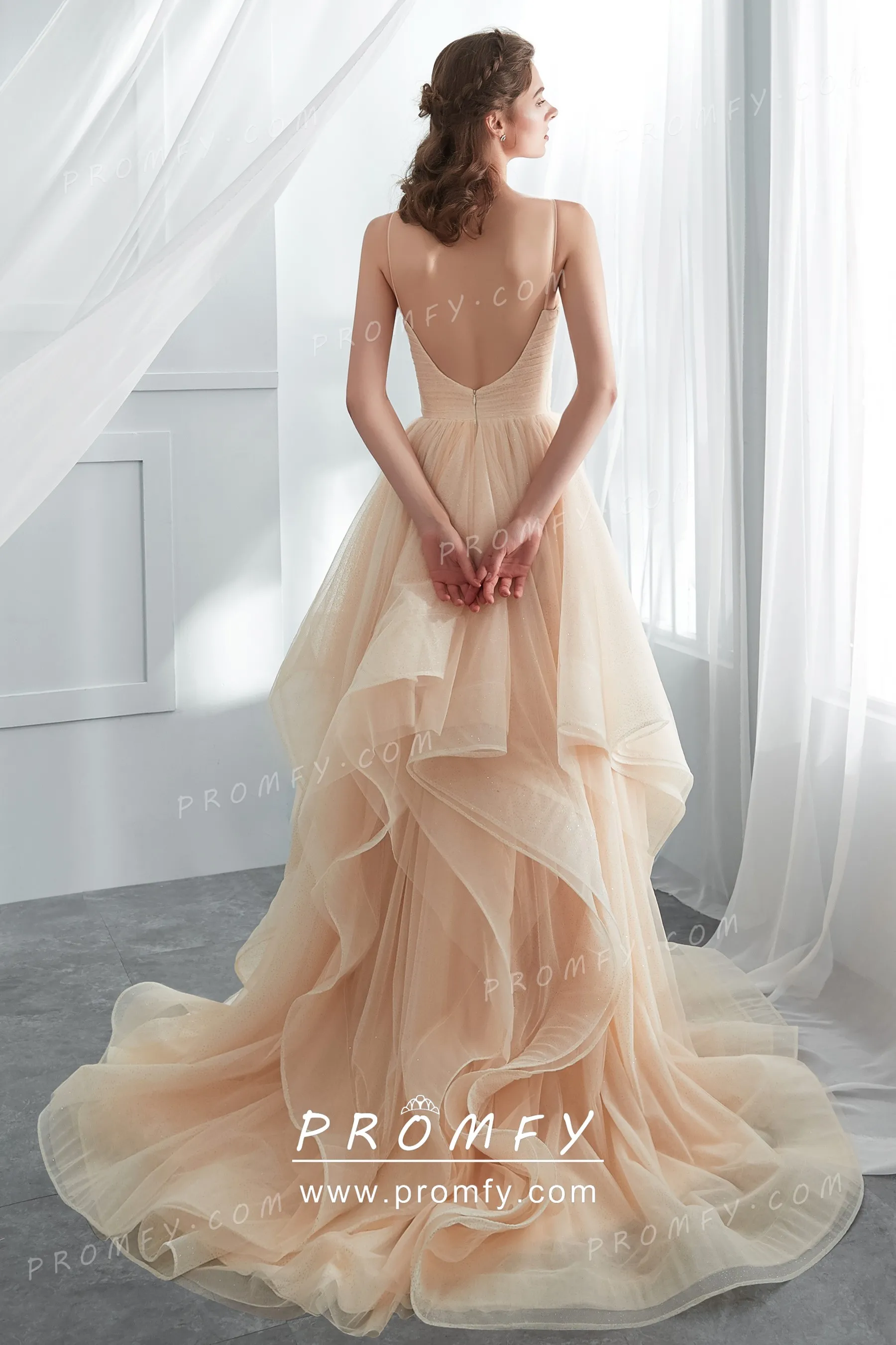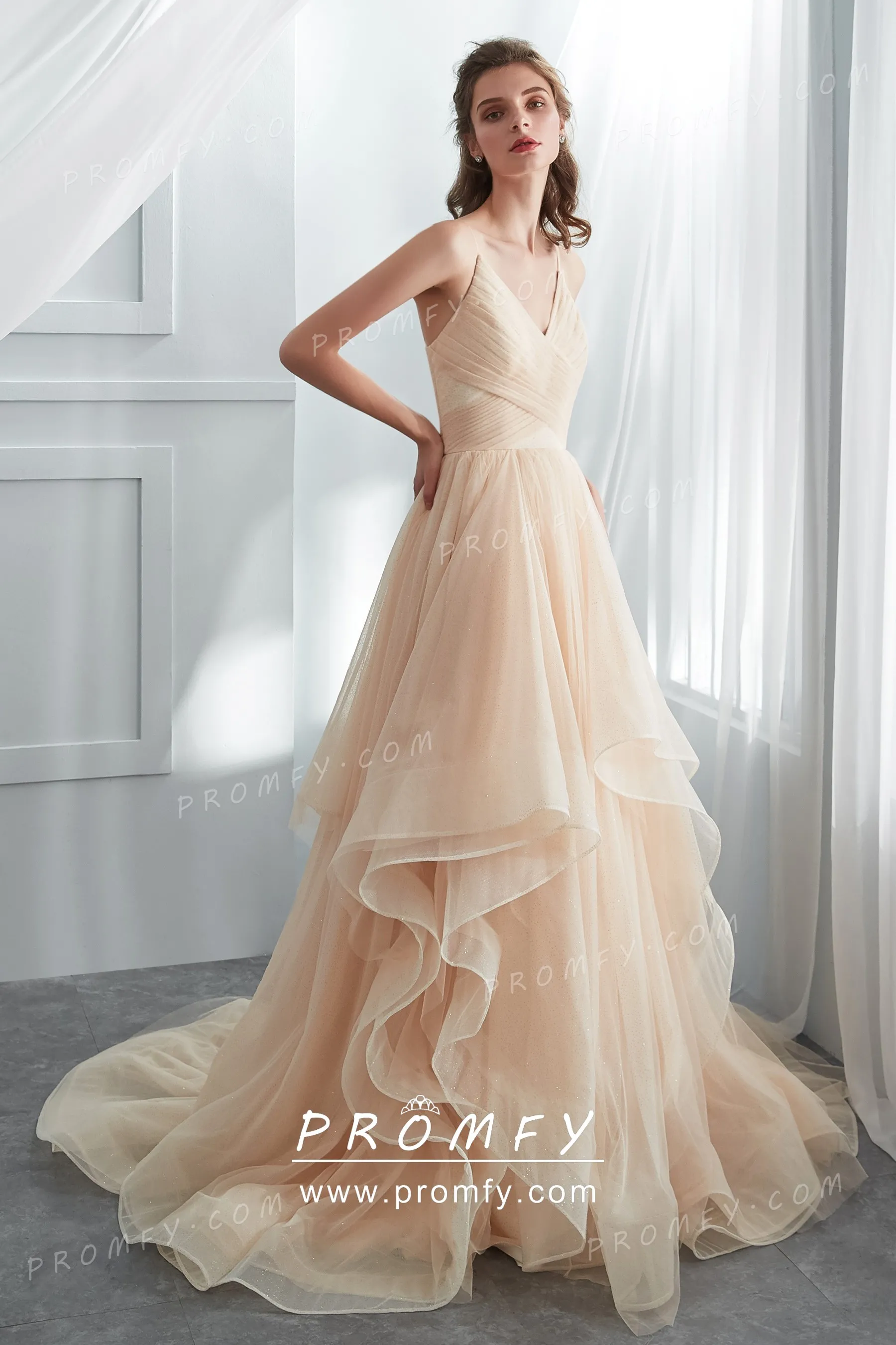 Modern and romantic, this champagne glitter tulle low back spring/summer/fall wedding gown has a V neck with spaghetti straps, chic-cross pleated bodice, romantic flounced ruffle soft tulle skirt with asymmetrical layers and court train.