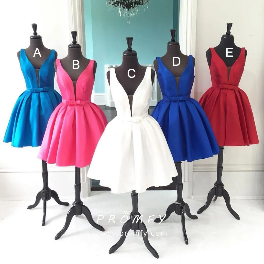 Timeless sleeveless curved V neckline short satin modern cocktail, homecoming, or prom party dresses. Natural waist with bow embellished. Blue, fuchsia, white and red colors.