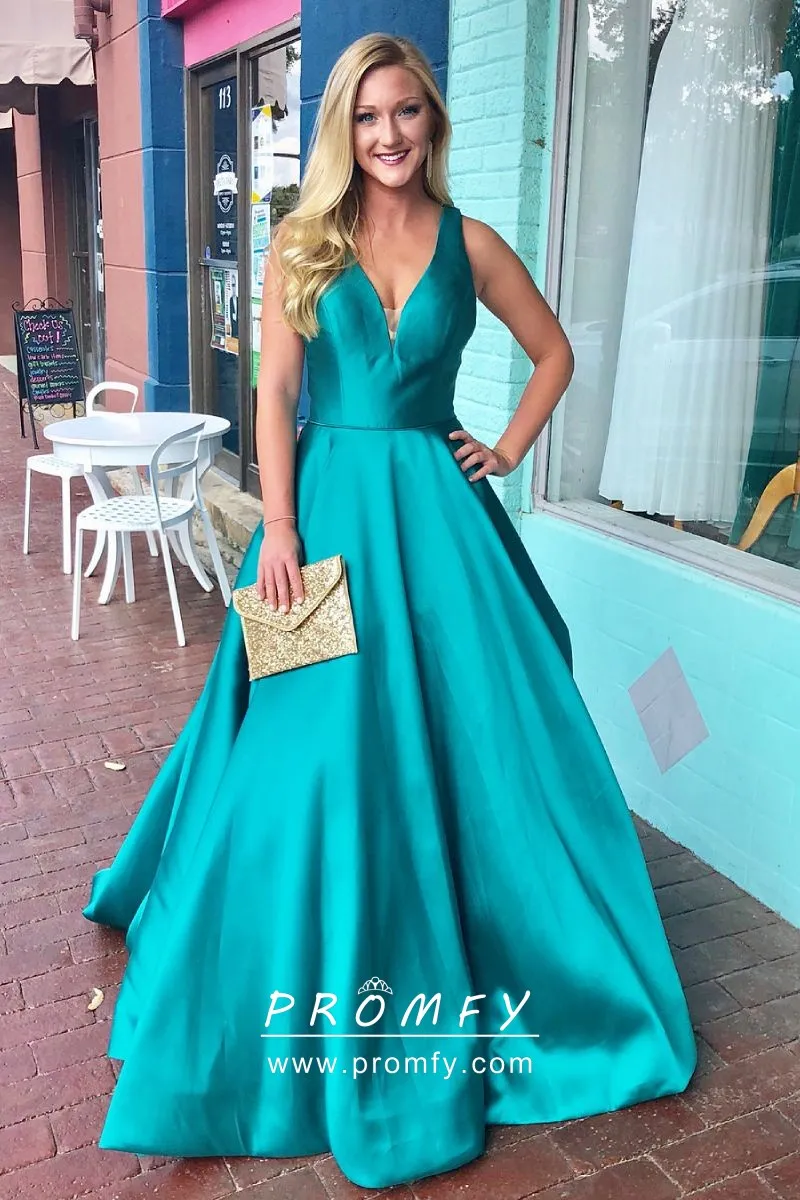 Classic cyan satin floor length ball gown prom, military ball, or wedding guest formal dress. Sleeveless, curved V neckline. Low V back.