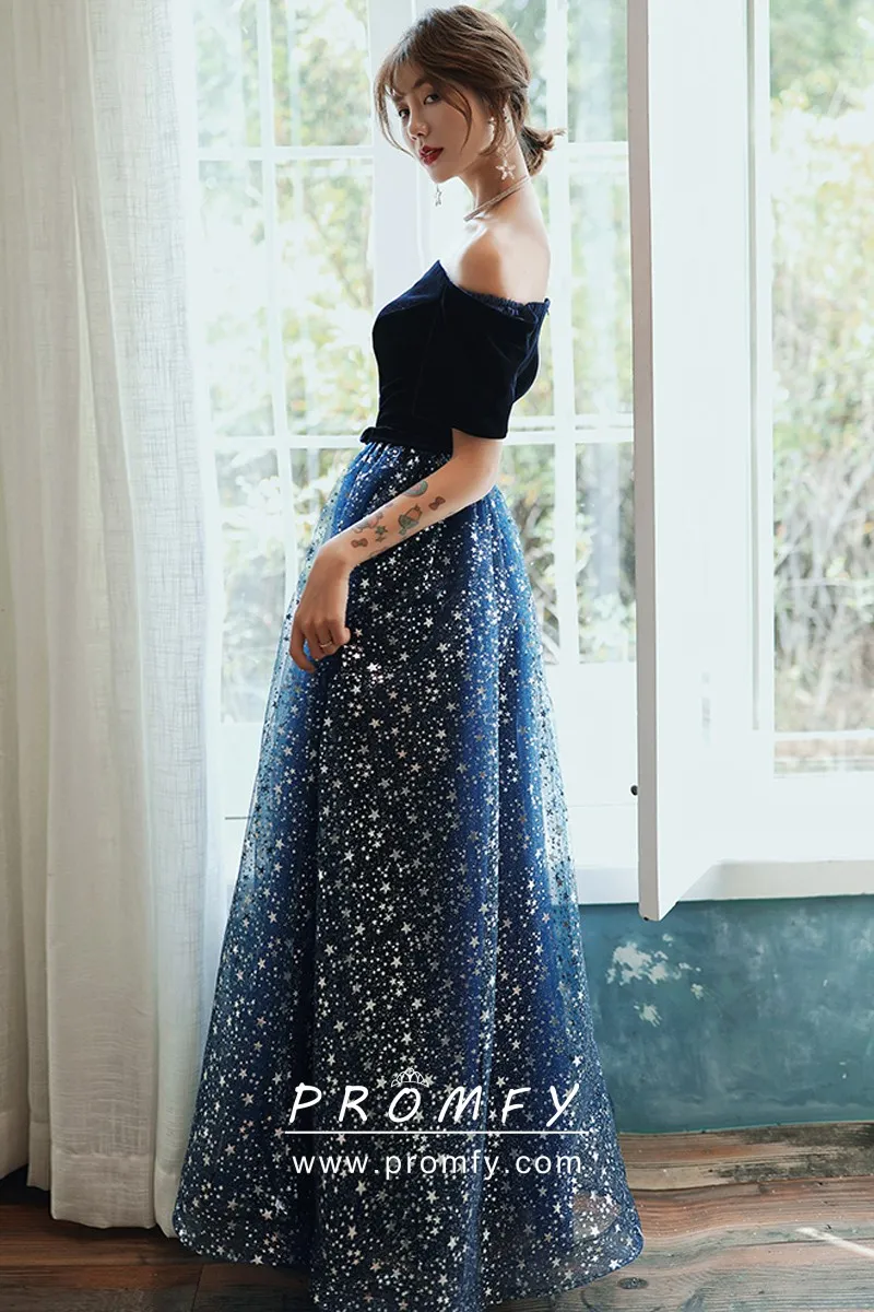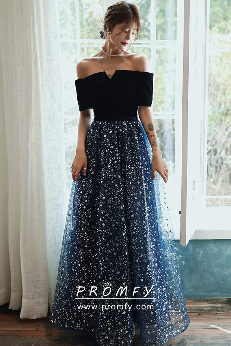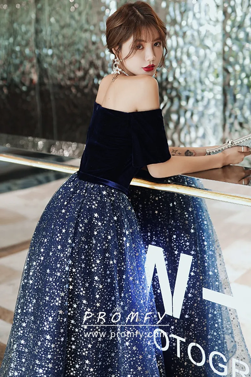 Fashion dark navy prom, wedding guest, or birthday party dress features a velvet bodice with off-the-shoulder V-shaped neckline short sleeves, and a stunning navy blue tulle skirt full of mini stars pattern.