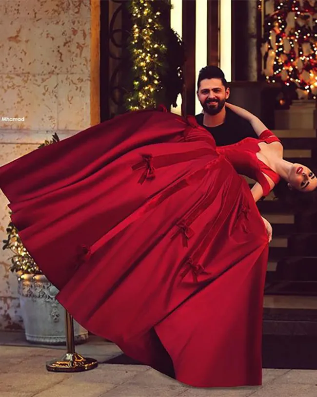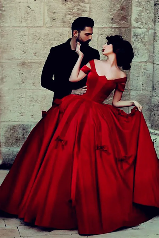 Dark Red Satin Bow Appliqued Engagement Ball Gown