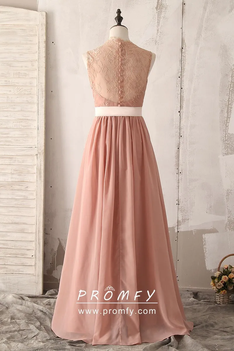 Full A-line dusty peach chiffon unique floor-length bridesmaid, military ball, or wedding guest dress, pleated V-neckline sleeveless bodice, illusion lace full back with button details.