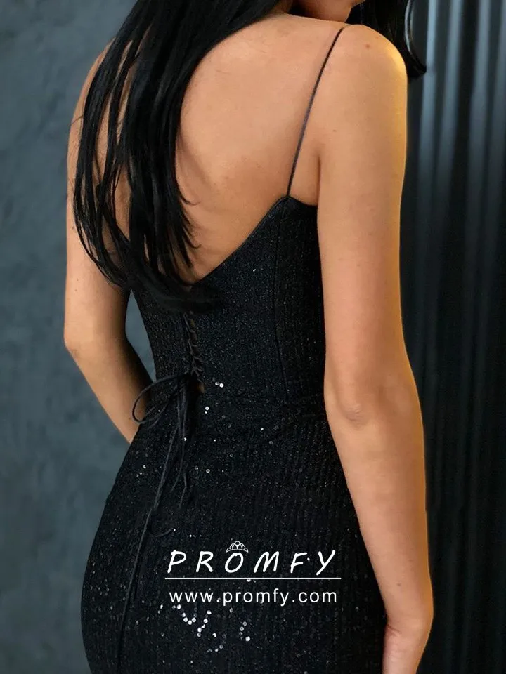 Elegant and sparkly black sequin slim mermaid floor length long simple evening prom formal dress. Sweetheart V neckline with spaghetti straps. Lace up low back.
