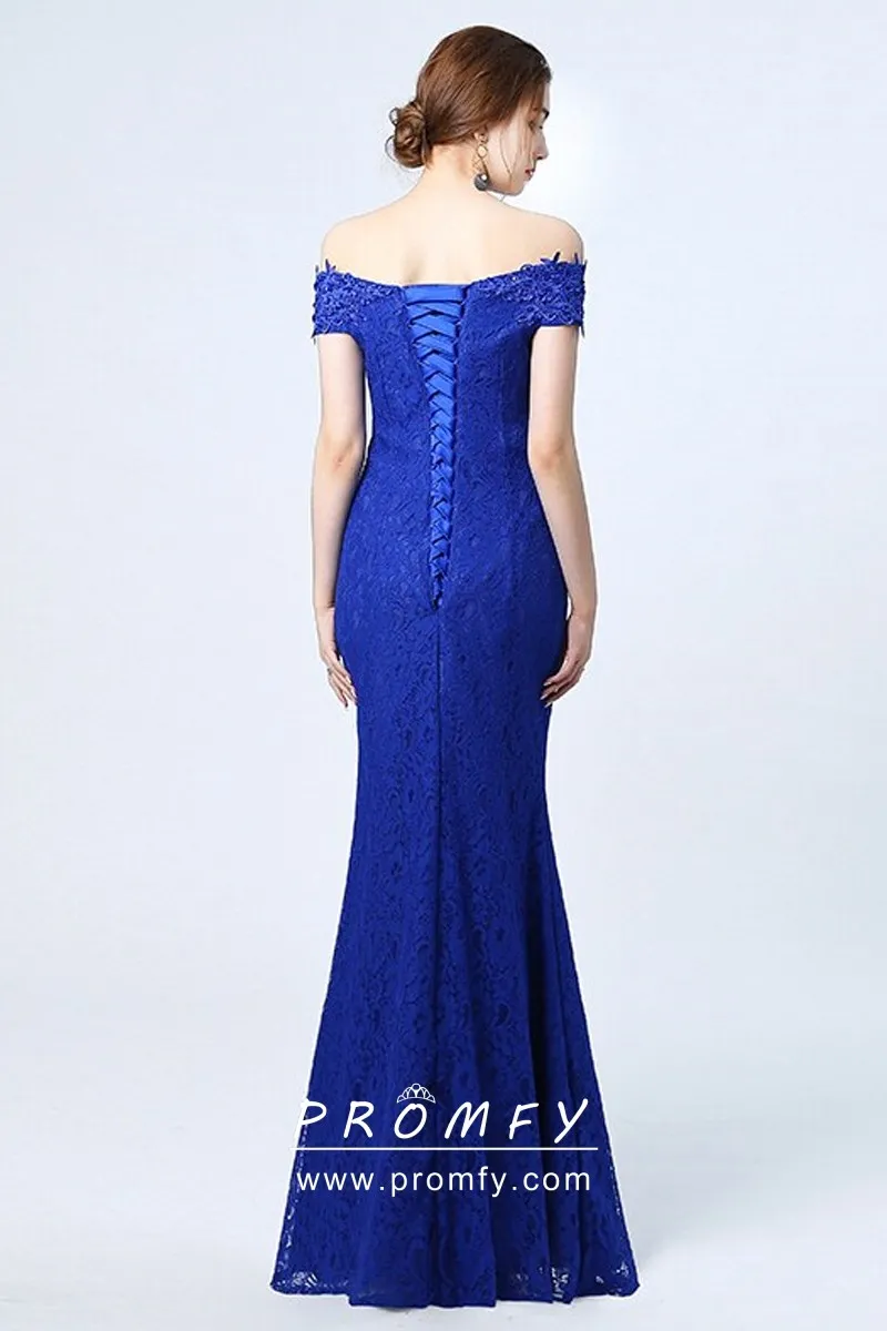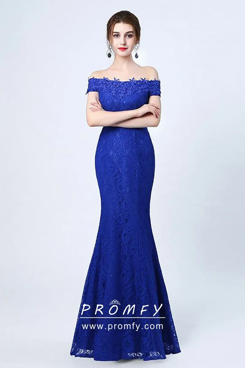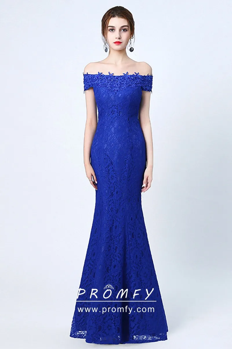 Elegant Cobalt Blue Lace Off-shoulder Formal Dress