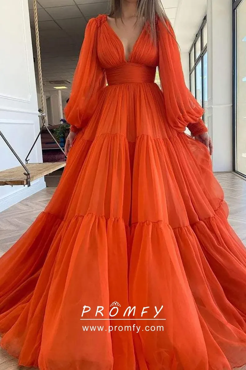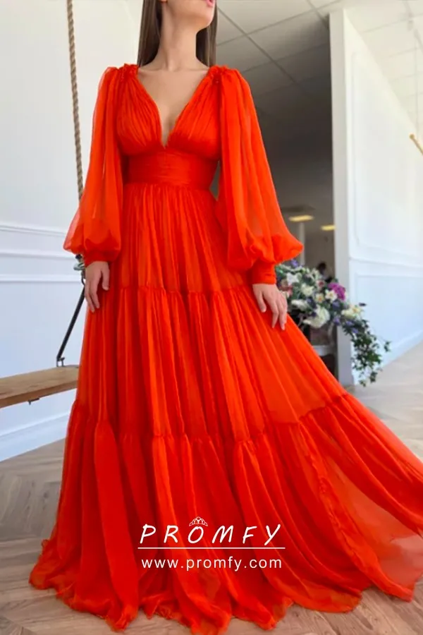 Unique orange chiffon puffy long sleeves plunging V neckline long evening prom dress. Flirty chiffon long party gown,