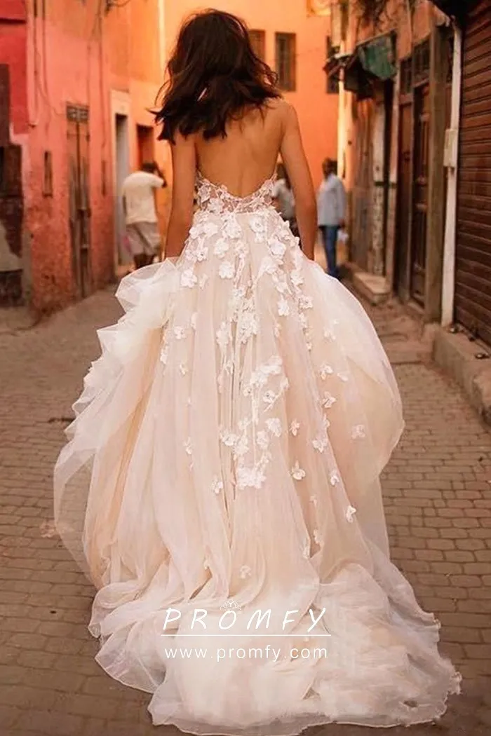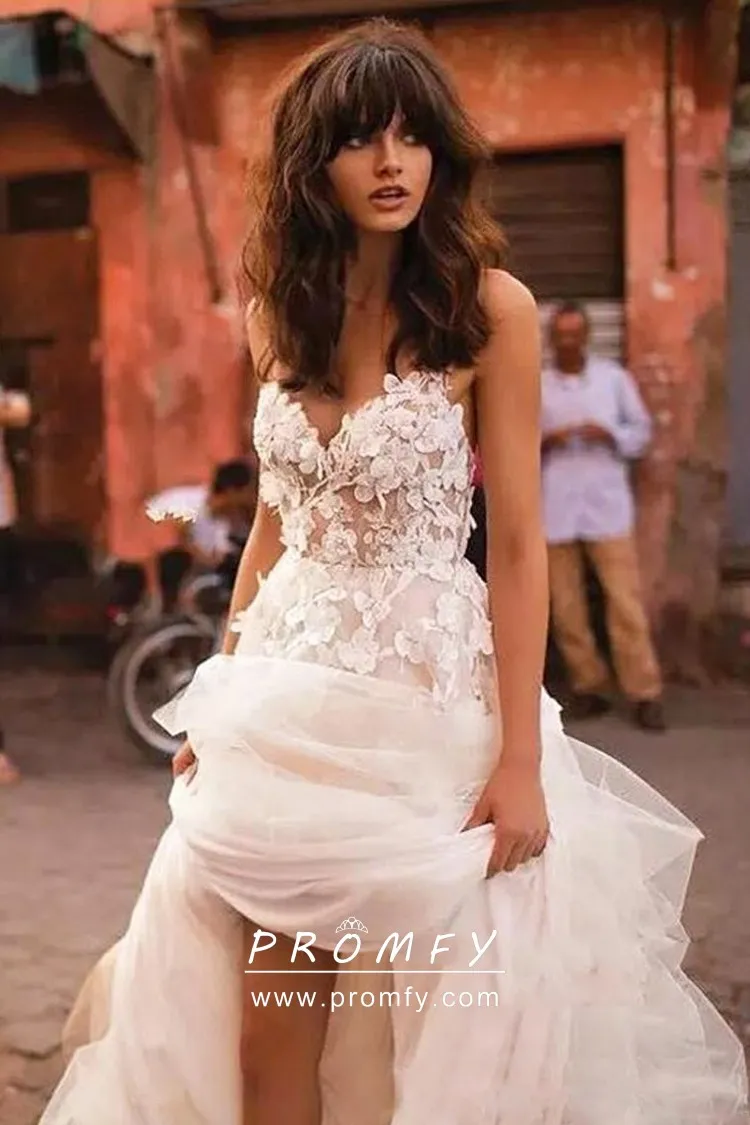 Charming floral lace appliqued strapless sweetheart bodice, ivory lace and tulle low back, and long train modern spring/summer/fall wedding dress.