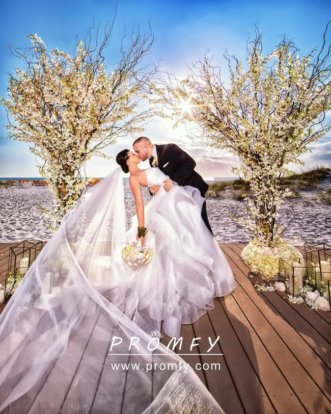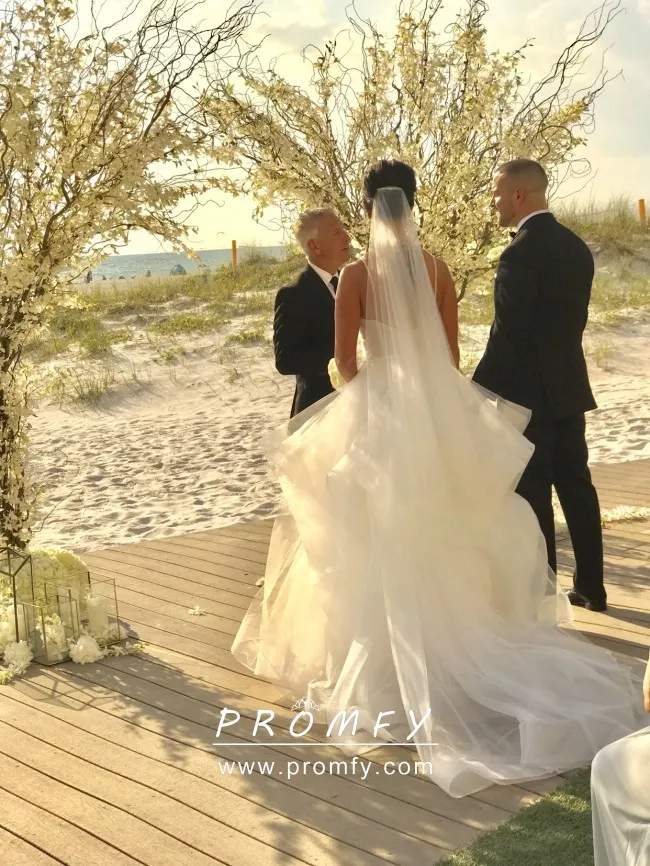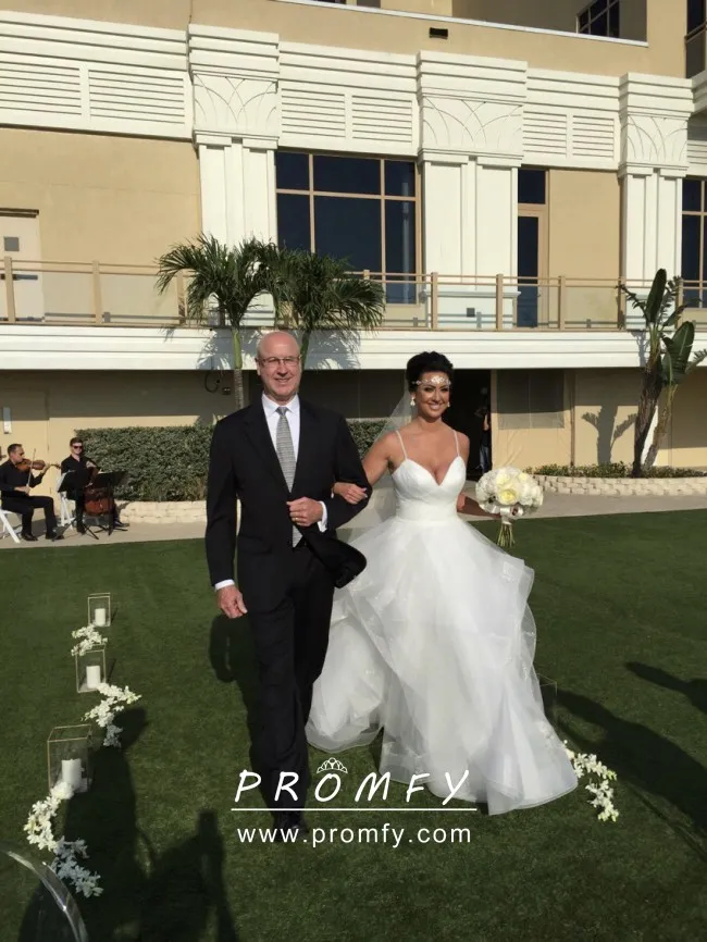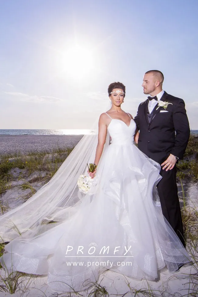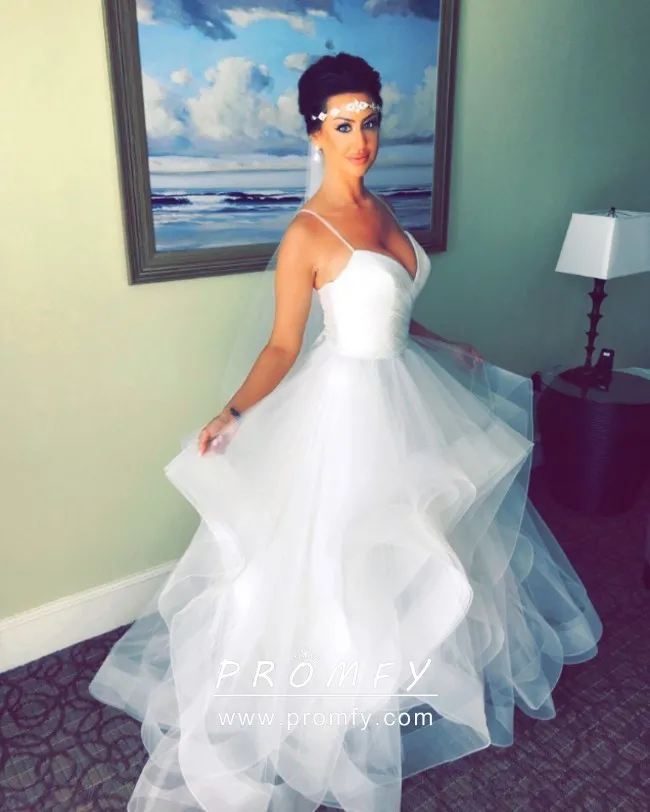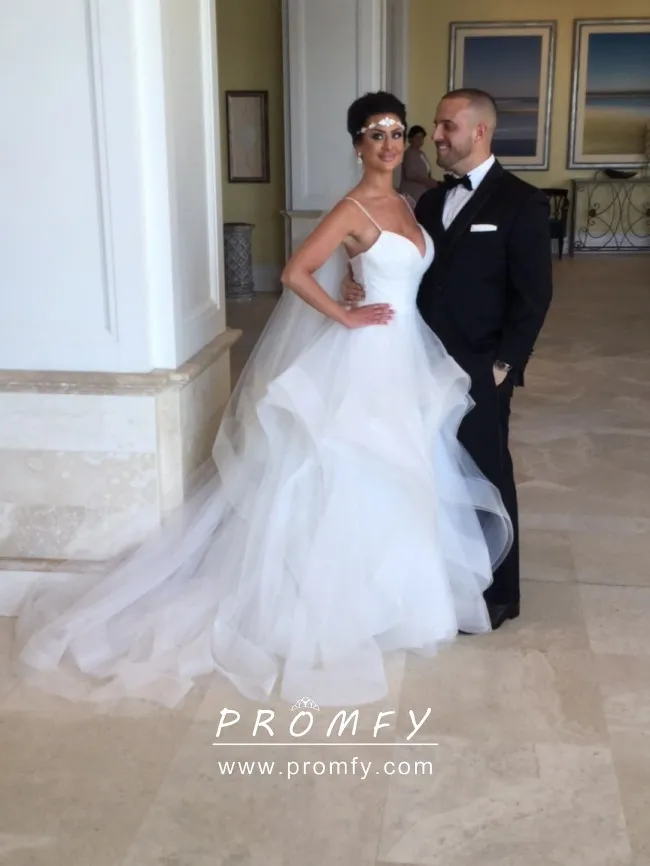 Gorgeous flounced white tulle outdoor floor-length ball gown destination wedding dress. Deep V neckline with spaghetti straps. Low back.