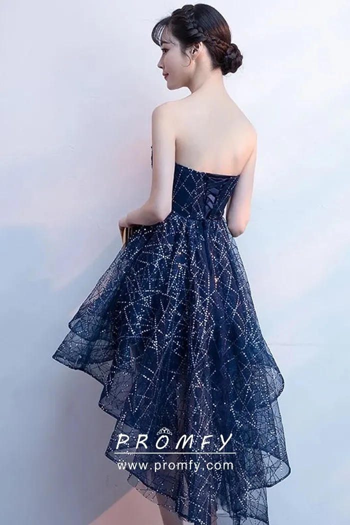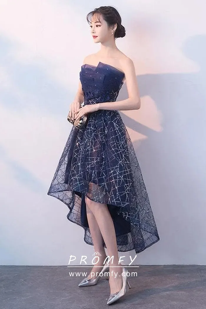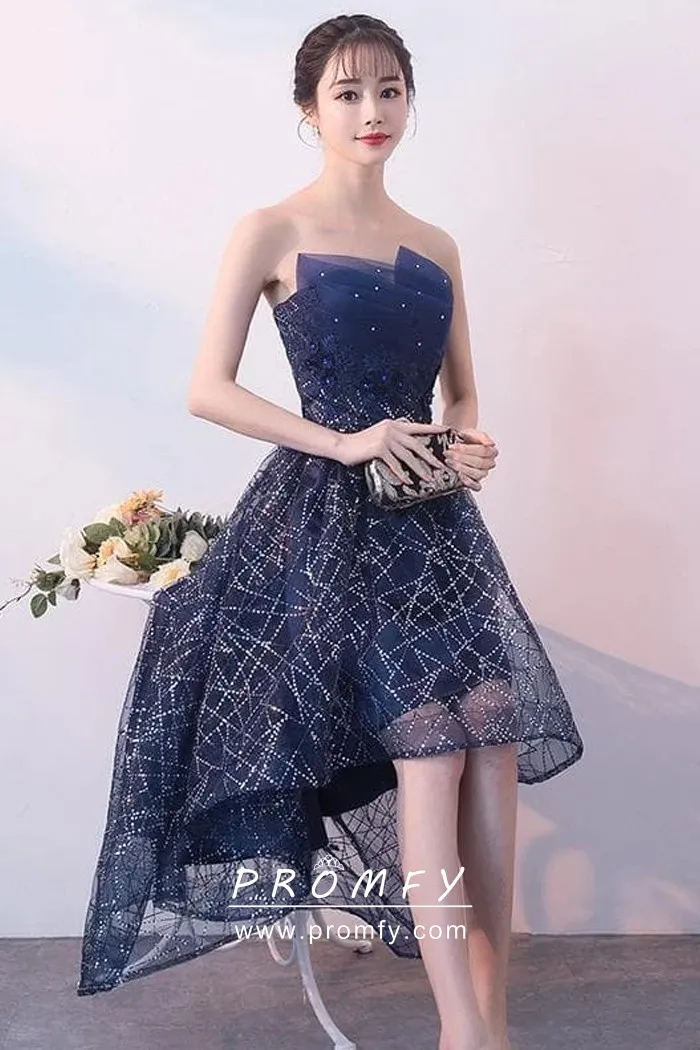 Glittering beaded space blue organza tea-length high-low prom, birthday, or cocktail party gown, asymmetrical neckline, strapless bodice scattered with beads, beaded space blue organza skirt, lace up back.