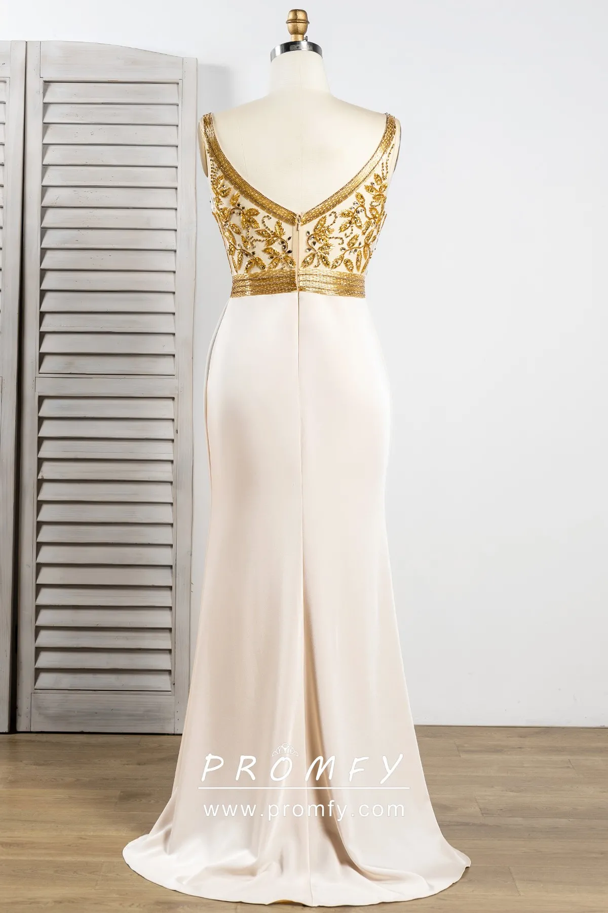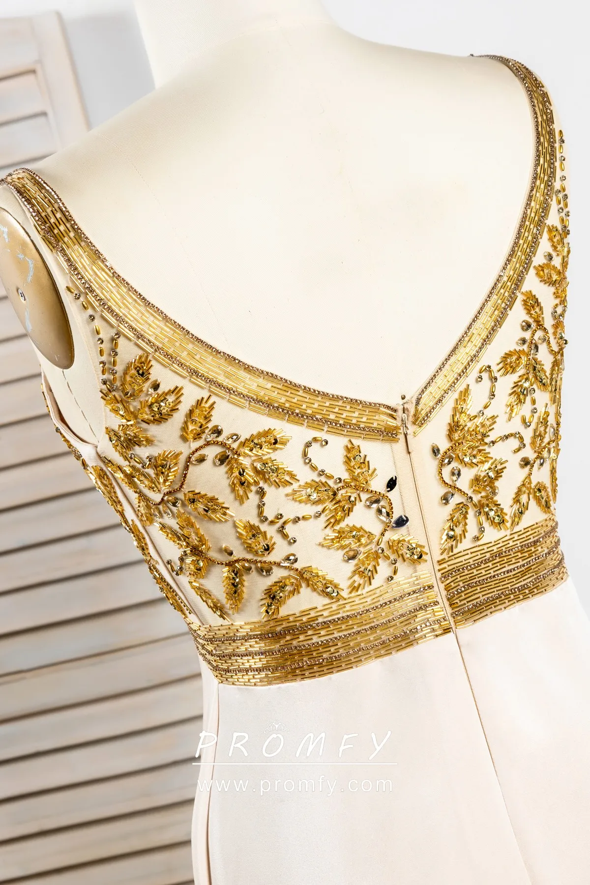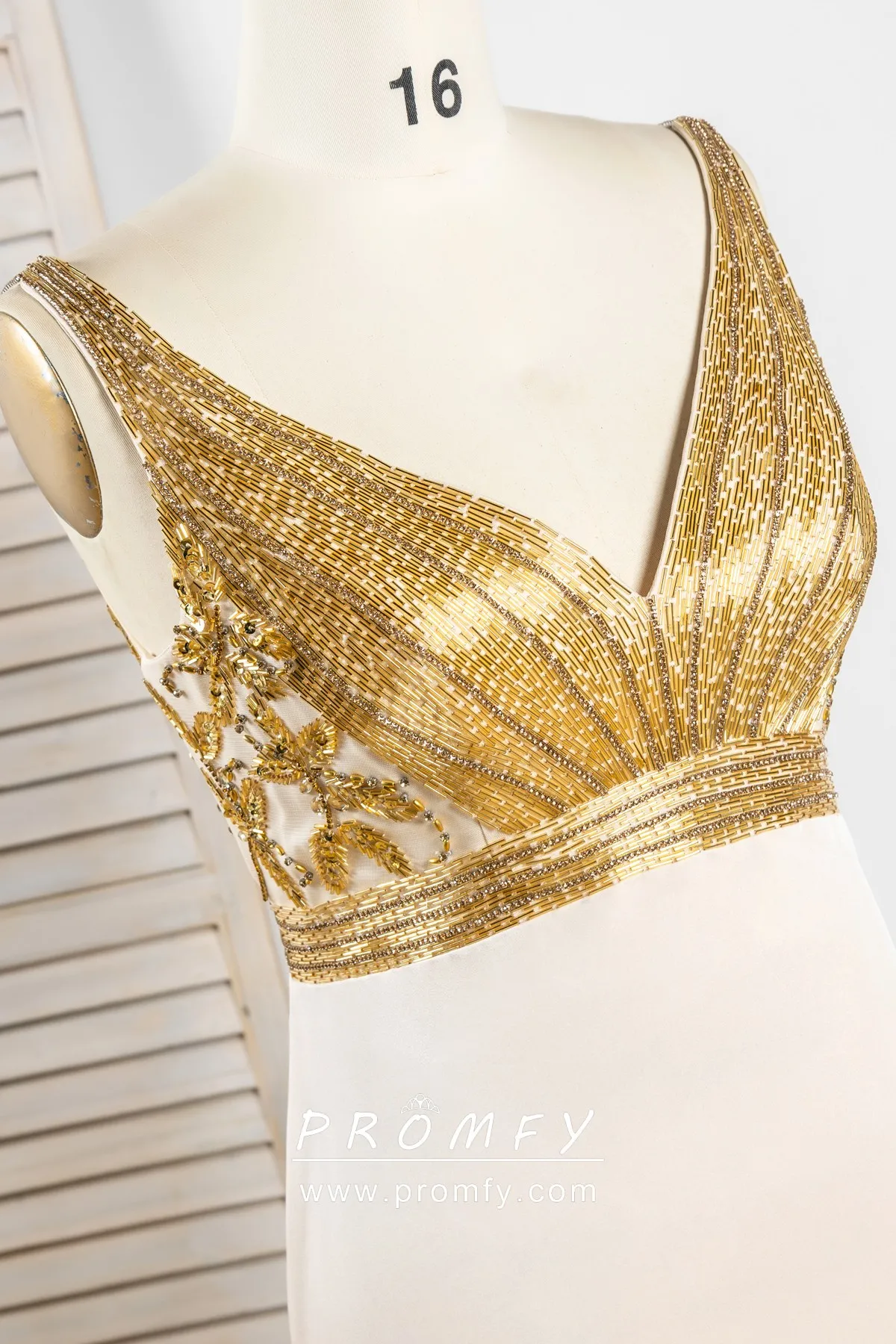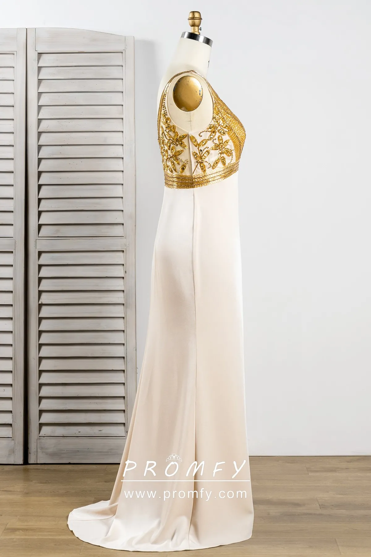 A luxury golden glitter and champagne satin sheath long evening prom formal dress. Features a heavy handmade metal beaded upper bodice, empire-waist, V-neckline with wide straps. Combined with a fitted fluent champagne satin long skirt with a sweep train.