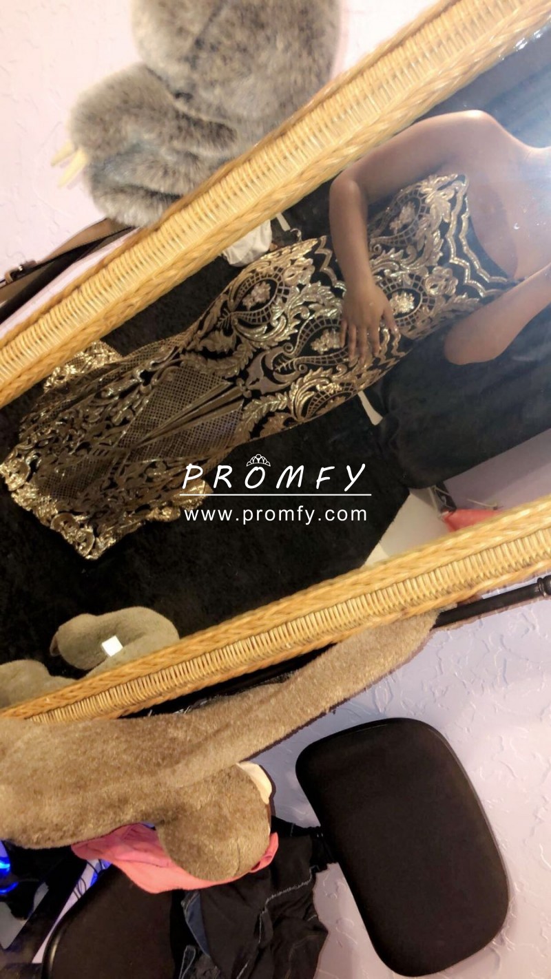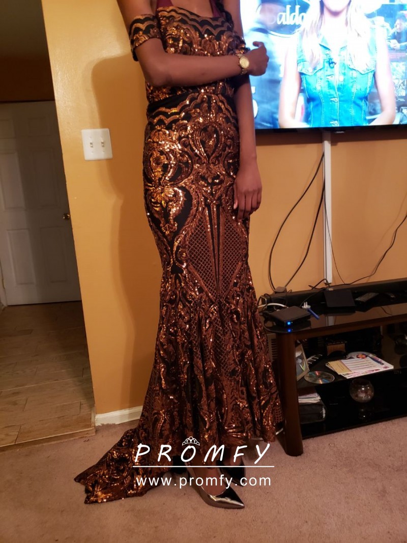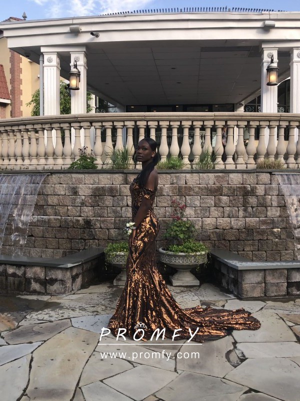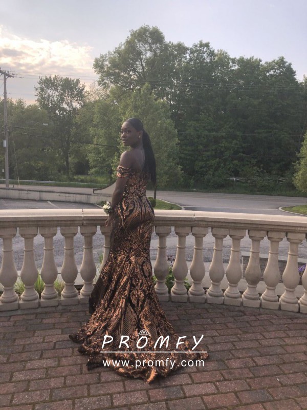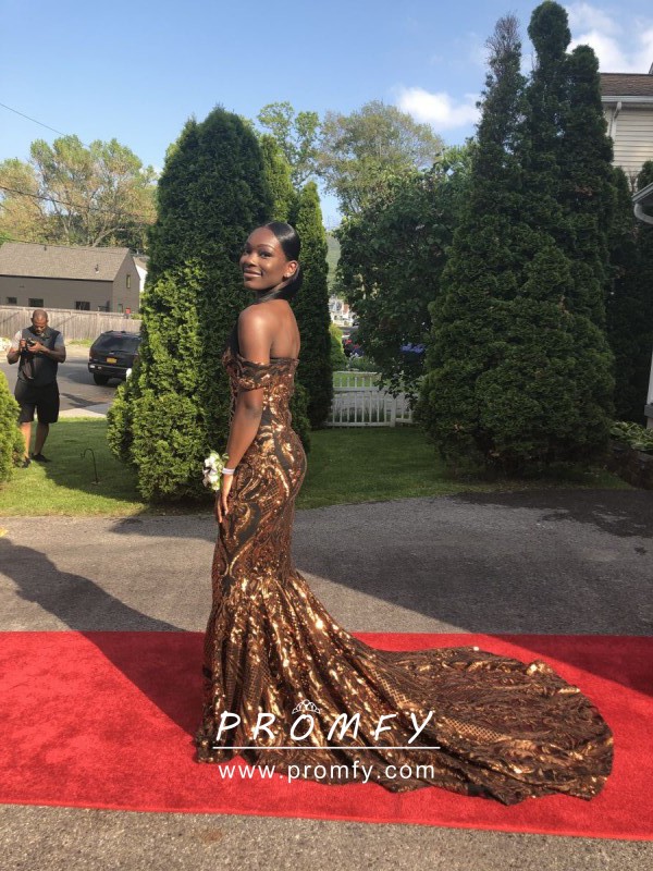 Sparkly gold abstract pattern sequin and black lining mermaid African American prom dress. Uniquely off-the-shoulder neckline. Long train.