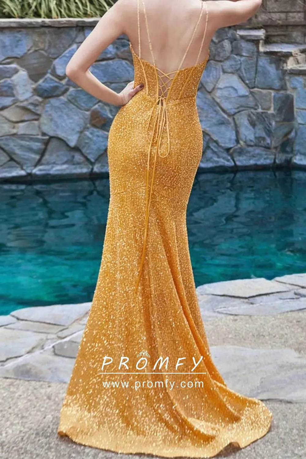 Be the star of the show when you step foot wearing this sparkly golden-yellow sequin split mermaid prom, evening, graduation, or military ball formal dress. A sweetheart corset bodice with thin straps, a short train, and a low back with lace-up straps.