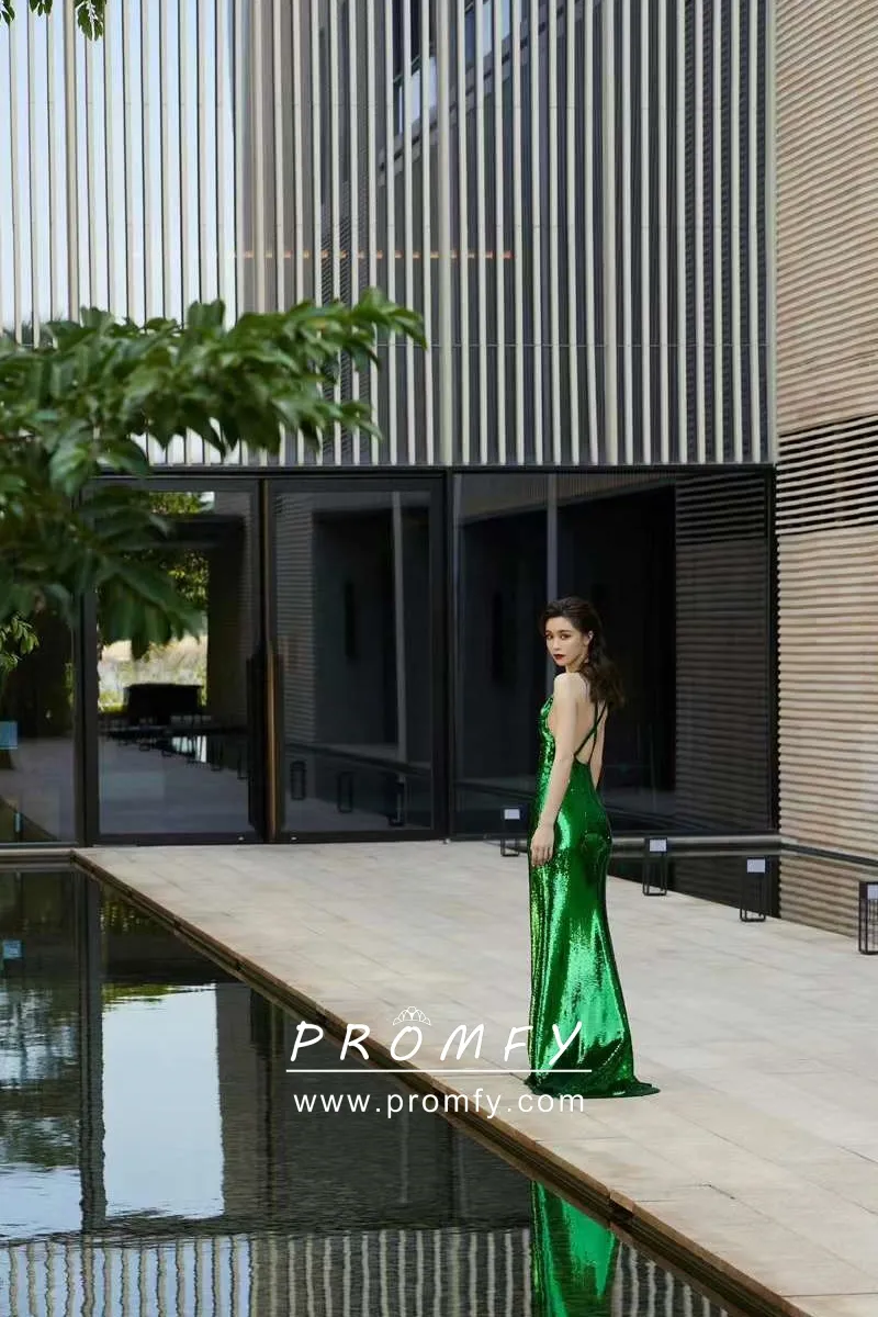 Metallic shining emerald green sequin slim-fit mermaid floor-length prom, military ball, wedding guest, or photoshoot dress. Sexy deep V neckline and low back with criss-cross straps. This gown is available in many colors, perfect for any event.
