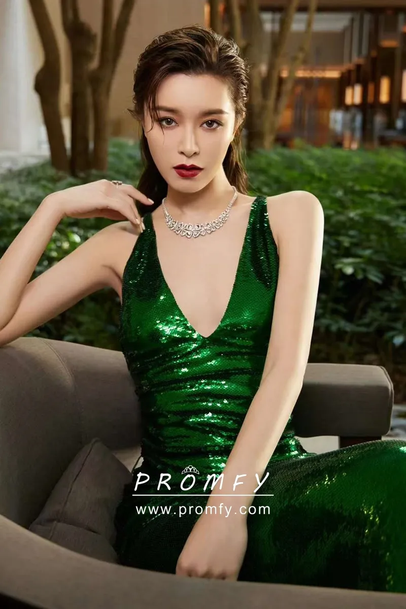 Shining Green Sequin V-neck Mermaid Metallic Formal Gown