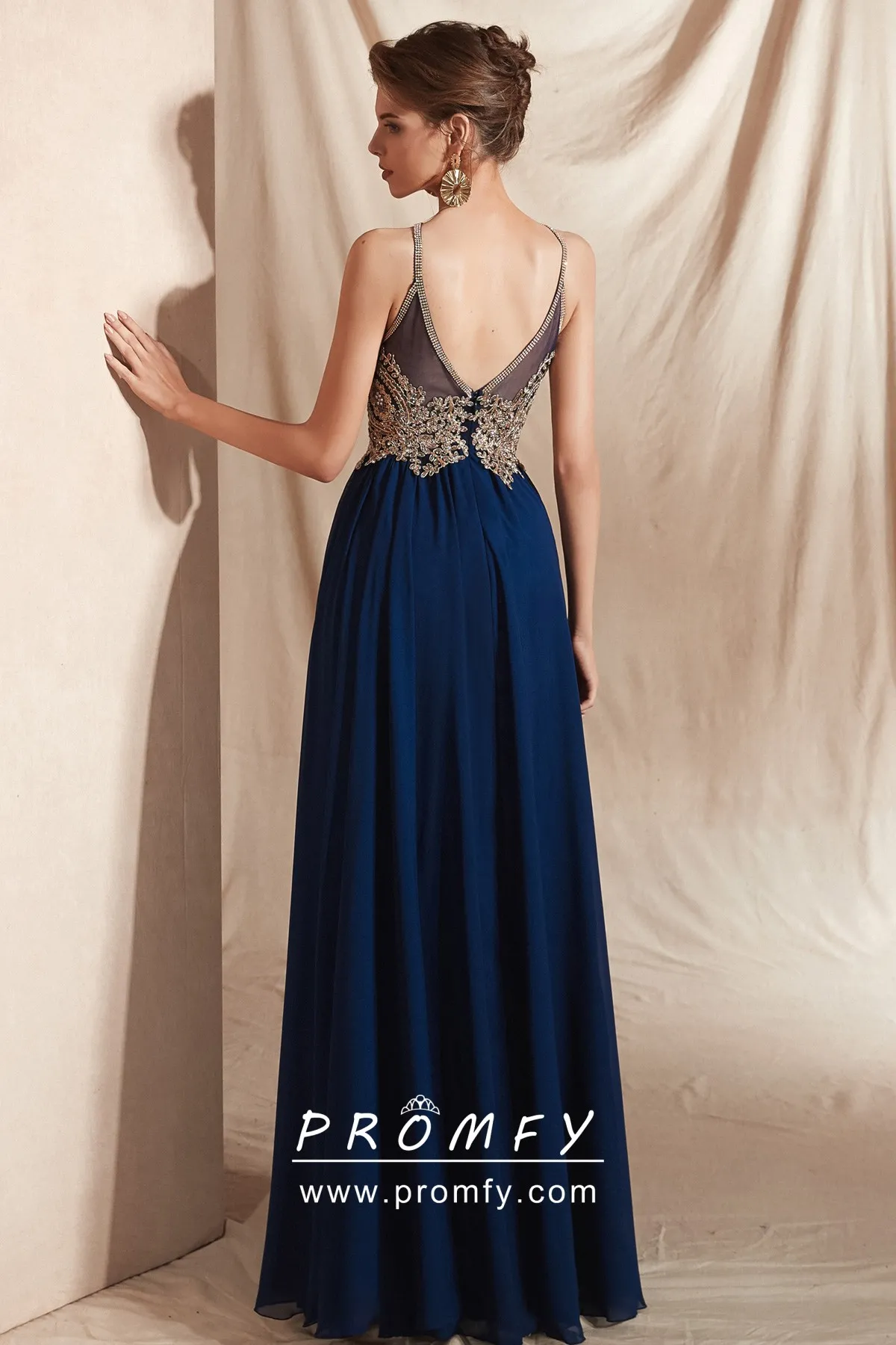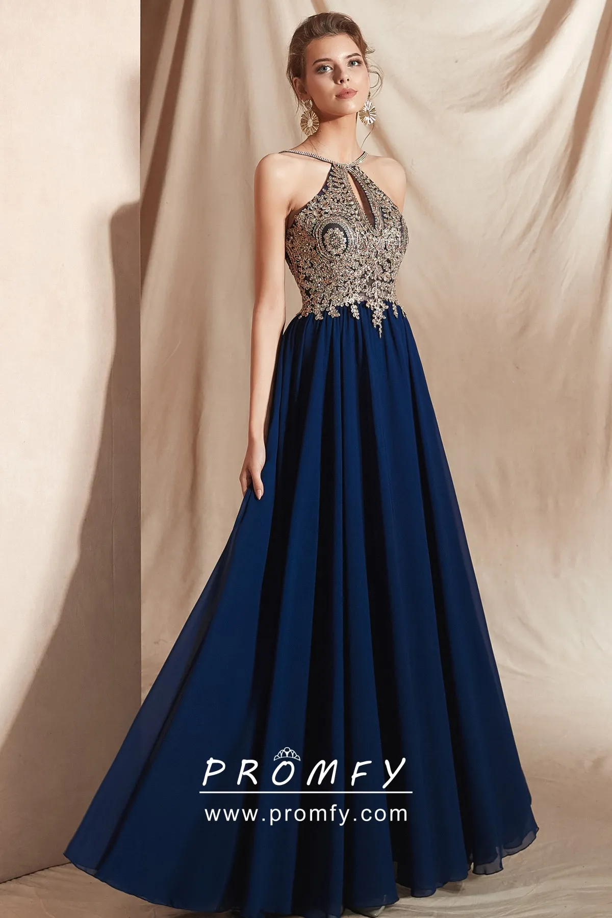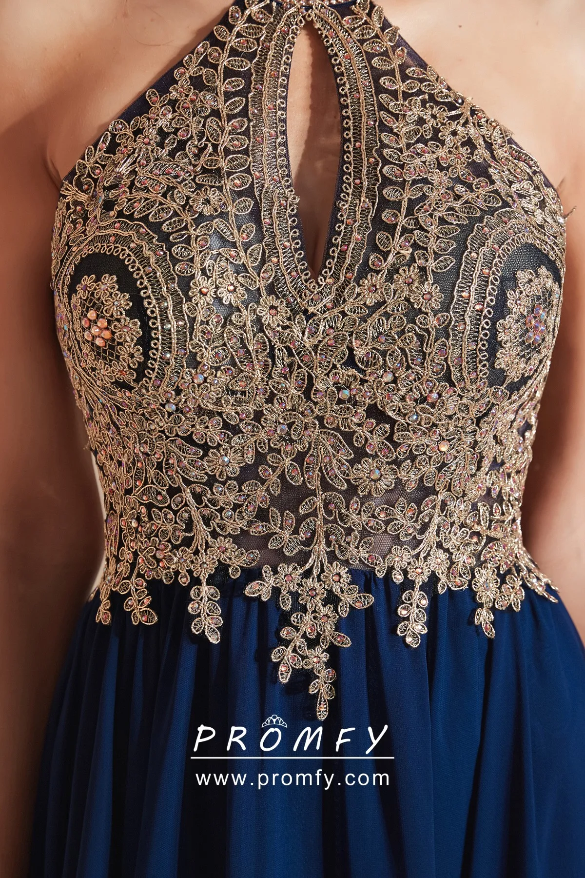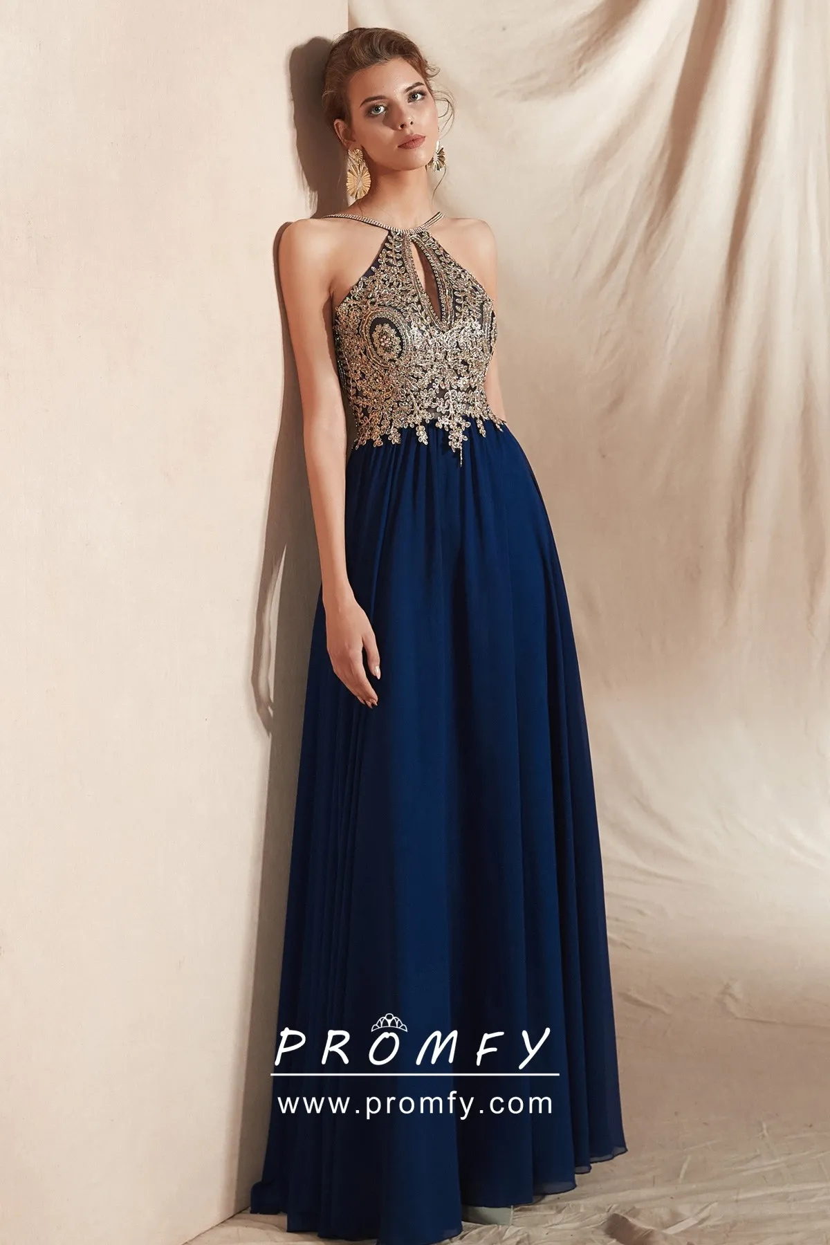 An honorable vintage dark blue chiffon prom, wedding guest, or evening formal dress features glittering gold lace on the top bodice with a halter neckline and a keyhole detail. The fluent chiffon hem softly falls to the floor length.