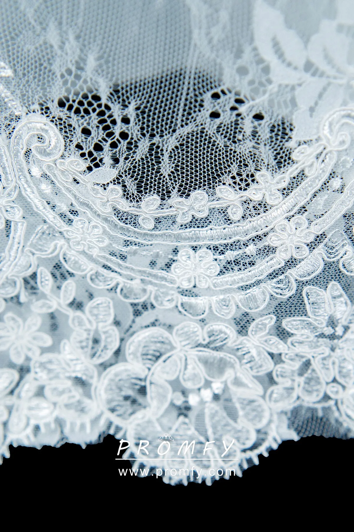 Illusion long sleeve scalloped illusion neckline lace bodice, white lace floor length A-line spring/fall modern wedding dress, illusion back with keyhole details and zipper up back, cathedral train.