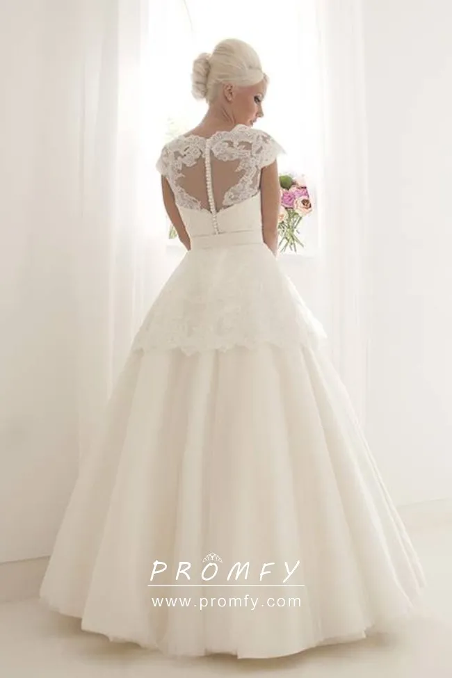 Traditional and vintage-inspired ivory tulle, satin, and lace sleeveless ballgown spring/fall wedding dress. Lace illusion neckline with sweetheart underneath and cap sleeves to the bodice with scallop lace edge trims the neckline and peplum.