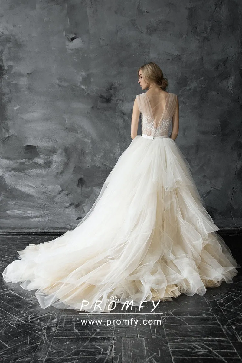 Luxury ivory and champagne tulle ball gown spring/fall/winter wedding dress with lace bodice and Cathedral train. Deep V neckline with sheer tulle straps. Low V back.
