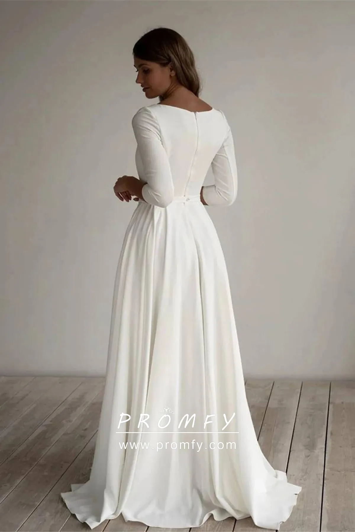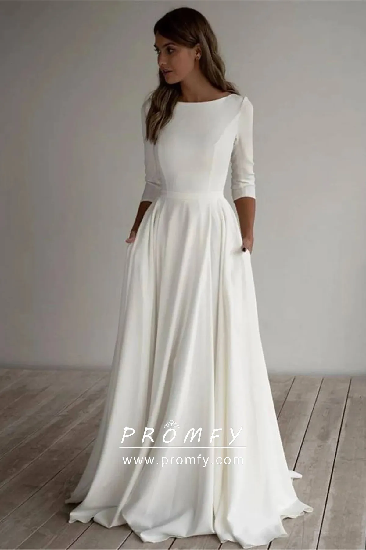 The simple ivory matte satin A-line spring/fall/winter wedding dress makes a statement of a minimalist bride! A bateau neckline, 3/4 sleeves, pockets, and a floor-length skirt. No train.