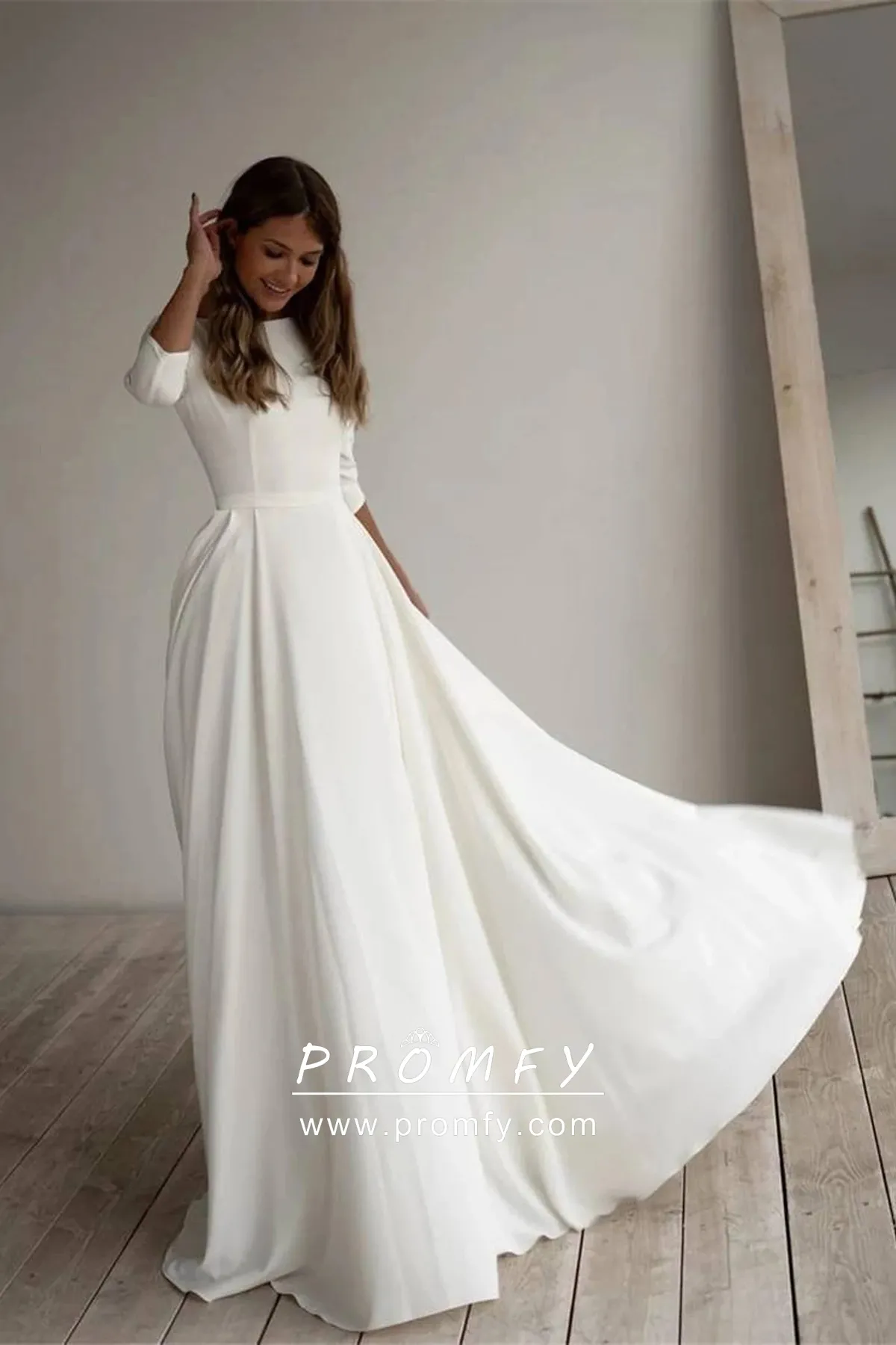 Ivory Satin 3/4 Sleeve A-line Minimalist Bridal Dress