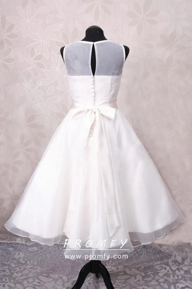 Ivory tea-length outdoor spring/summer destination bridal dress with illusion mesh overlay. Sleeveless illusion neckline short puffy bridal shower dress.