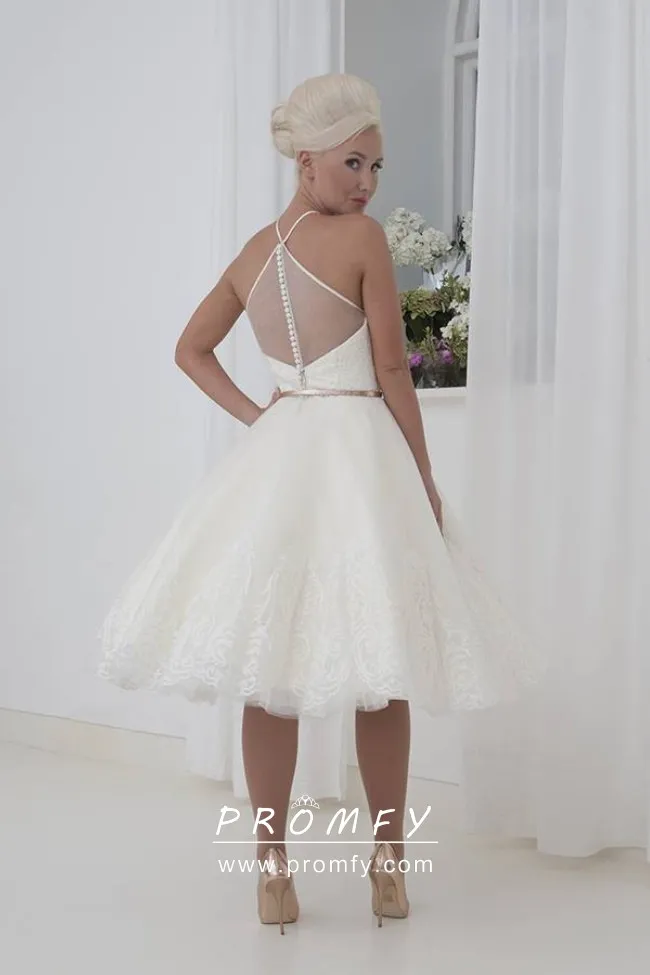 Cute knee-length short spring/summer/fall wedding, bridal shower, or reception dress with spaghetti strap halter neckline. Ivory overlay made up of tulle and lace. llusion back with decorative buttons.