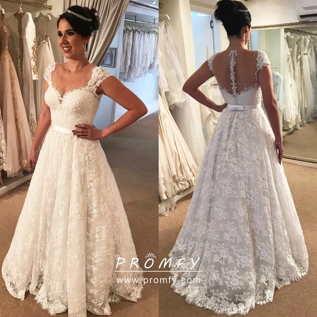 Vintage Ivory Lace Cap Sleeve Pearled Wedding Dress