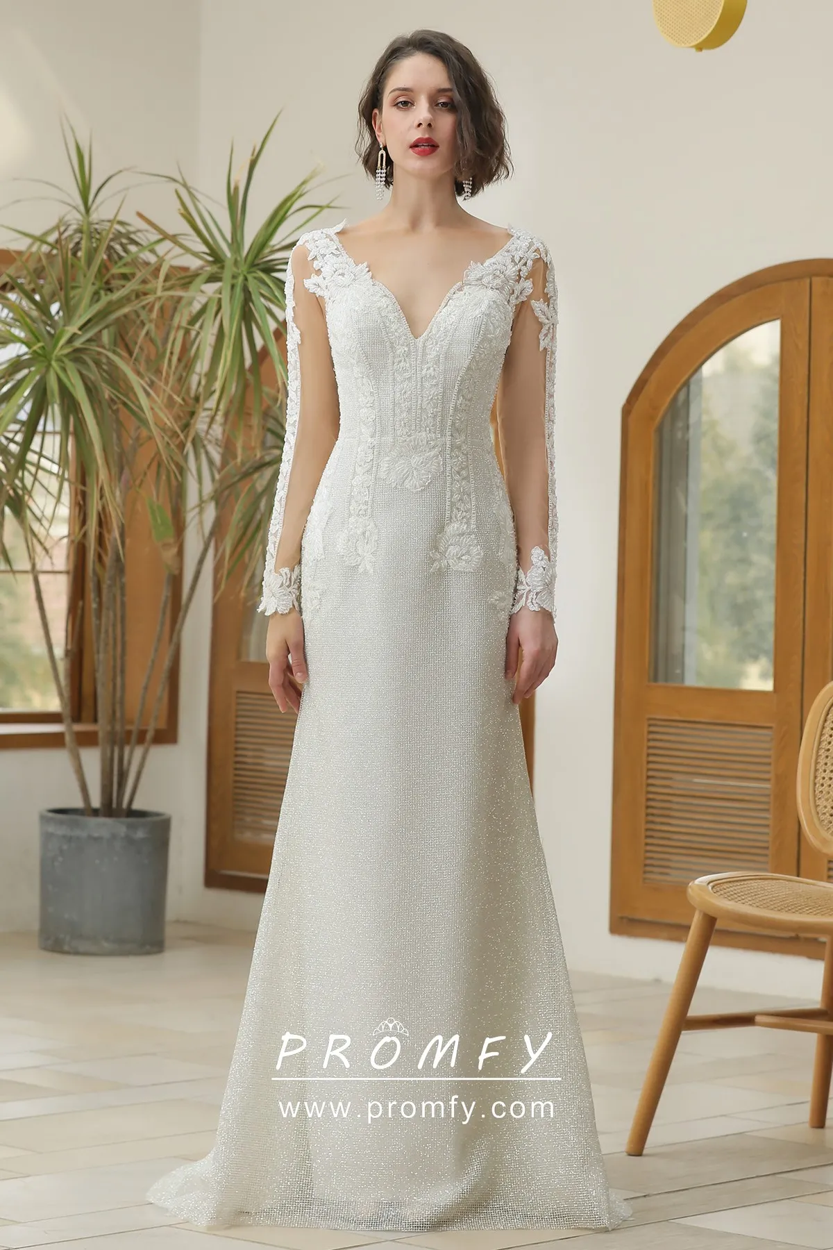 Sophisticated ivory lace and glitter mesh long mermaid spring/fall wedding dress. Curved V neckline illusion lace long sleeves bodice, glitter tulle mermaid skirt, illusion back and sweep train.