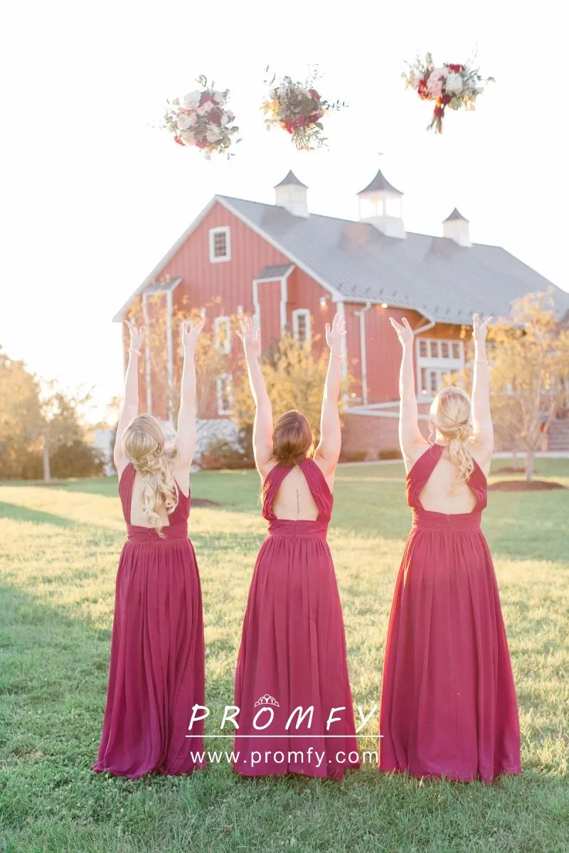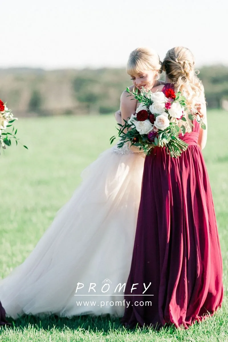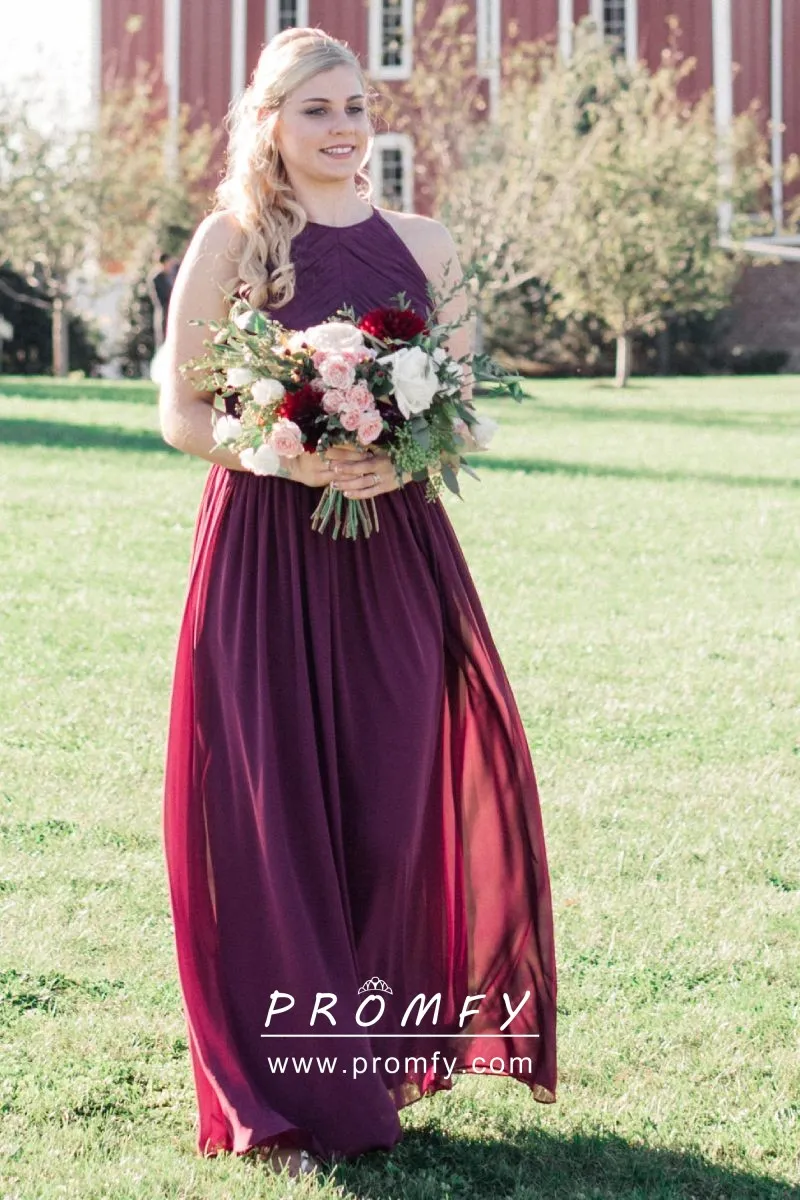Timeless maroon chiffon A-line long bridesmaid or wedding guest dress. Pleated sleeveless bodice with a crew neckline.