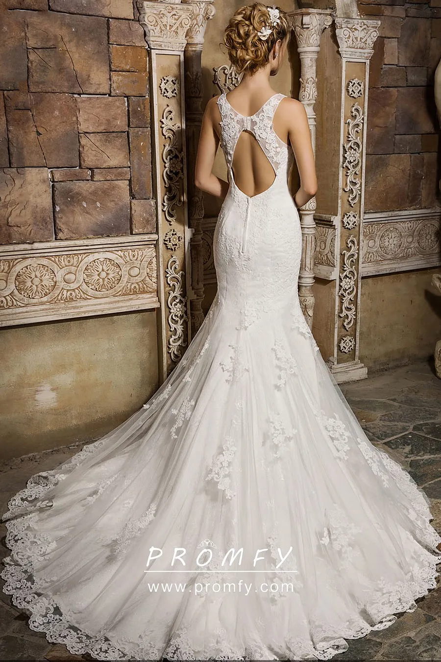 Classic lace and tulle mermaid floor-length spring/fall wedding dress. Deep V neckline with sweetheart bodice and wide shoulder straps. Keyhole back. Chapel train.