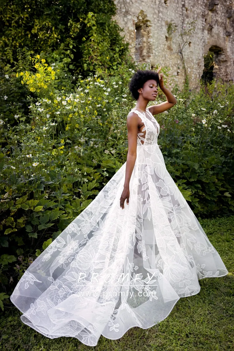 This modern designer spring/summer wedding dress is crafted from delicate sheer fabric adorned with laser-cut floral lace. The sleeveless bodice with a sheer deep V-neckline, and a voluminous skirt extending into a sweeping train.