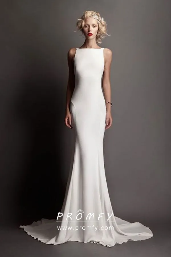 Modern & simple off-white satin slim mermaid floor-length long spring/summer/fall wedding dress. Sleeveless flattering bridal shower dress with a court train.